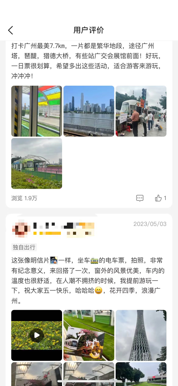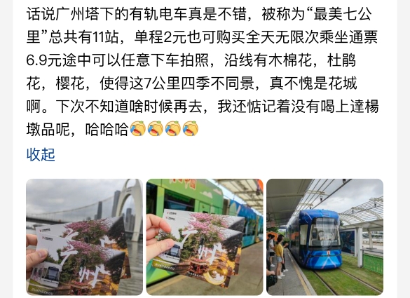 “广州塔下的有轨电车真是不错,6.9元可以途中任意下车拍照,沿线还有木棉花、杜鹃花、樱花,使得这7公里四季不同景,真不愧是花城。”游客cinderelladu在网上留言。另一位五一来穗游玩的网友,在有轨电车感受到广州春日的浪漫:“这张像明信片一样的电车票,非常有纪念意义,窗外的风景优美,车内的温度也很舒适,花开四季,浪漫广州。”