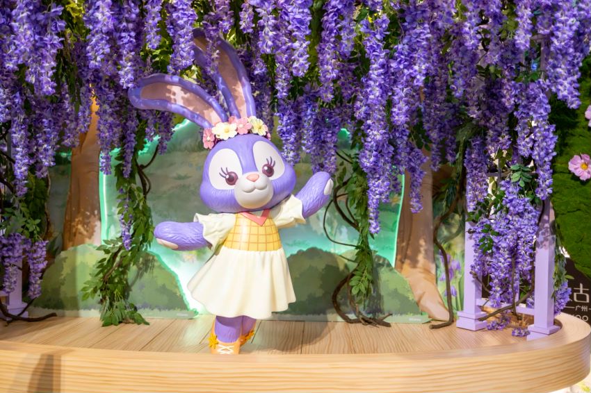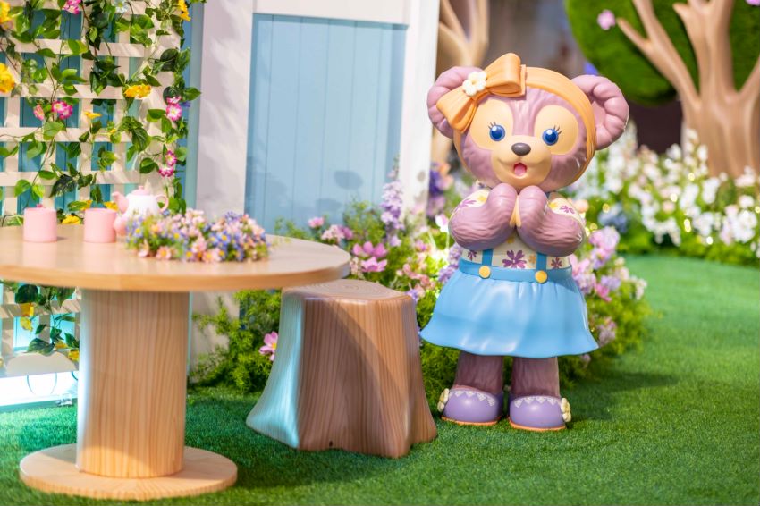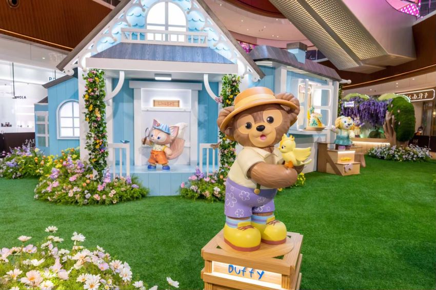 此次展览还原了达菲与好友在森林小屋的玩耍场景,宾客穿过绿植环绕的拱门,就进入了达菲与好友的故事世界,和达菲、雪莉玫、杰拉多尼、星黛露、可琦安、奥乐米拉和玲娜贝儿一起欢乐玩耍。
