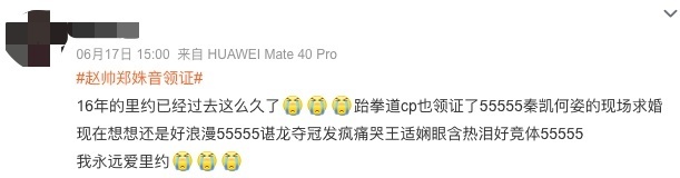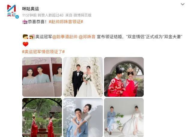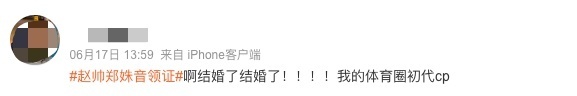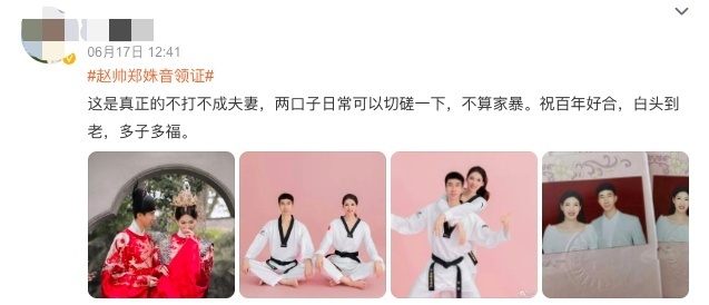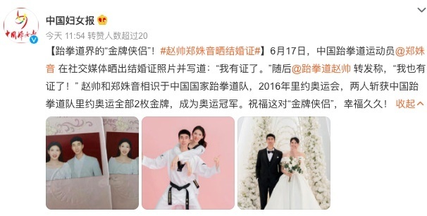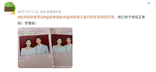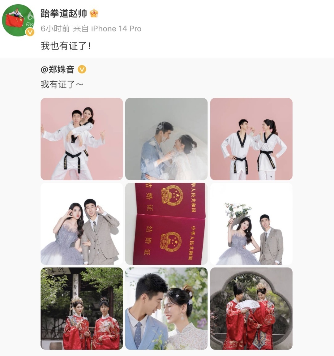 6月17日,中国跆拳道运动员郑姝音在社交媒体晒出结婚证照片并写道:“我有证了。”随后赵帅转发这条社交媒体,“我也有证了!”