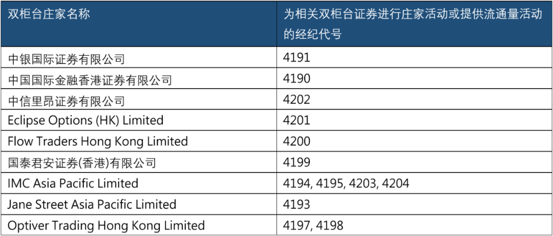 此外,9家庄家牌照则包括中银国际证券有限公司、中国国际金融香港证券有限公司、中信里昂证券有限公司等券商。从庄家的作用来看,一方面,庄家为双柜台股票买卖双方提供持续报价,成为投资者买卖股票的交易对手,为市场注入流动性;另一方面,在双柜台存在价差时进行跨柜台交易,比如买入报价较低的港币柜台股票,在人民币柜台以较高价格卖出,更多股票由此将从港币柜台转至人民币柜台,套利的同时双柜台间的价差也会缩小。
