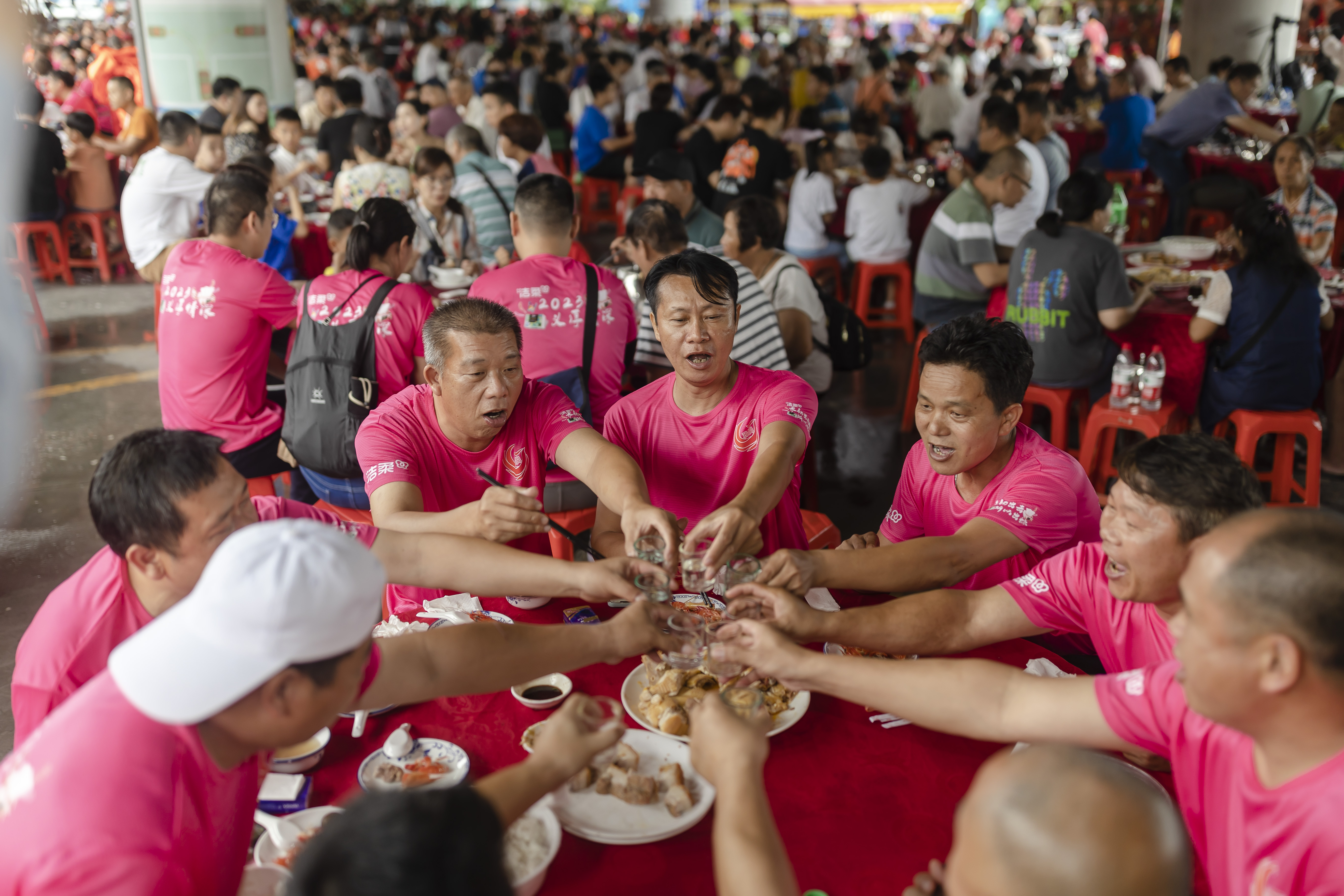 6月18日是农历五月初一,广州市白云区石门街鸦岗村村民、龙船“扒仔”“扒女”共计2000多人,分别从水路、陆路出发,前往人和镇蚌湖“走亲戚”,参加“蚌湖景”龙舟自由竞渡。时隔三年,两地乡亲再次聚首十分欢喜,蚌湖片区筵开近400桌美味龙船饭,招待鸦岗乡亲、龙船队员及各方宾客。