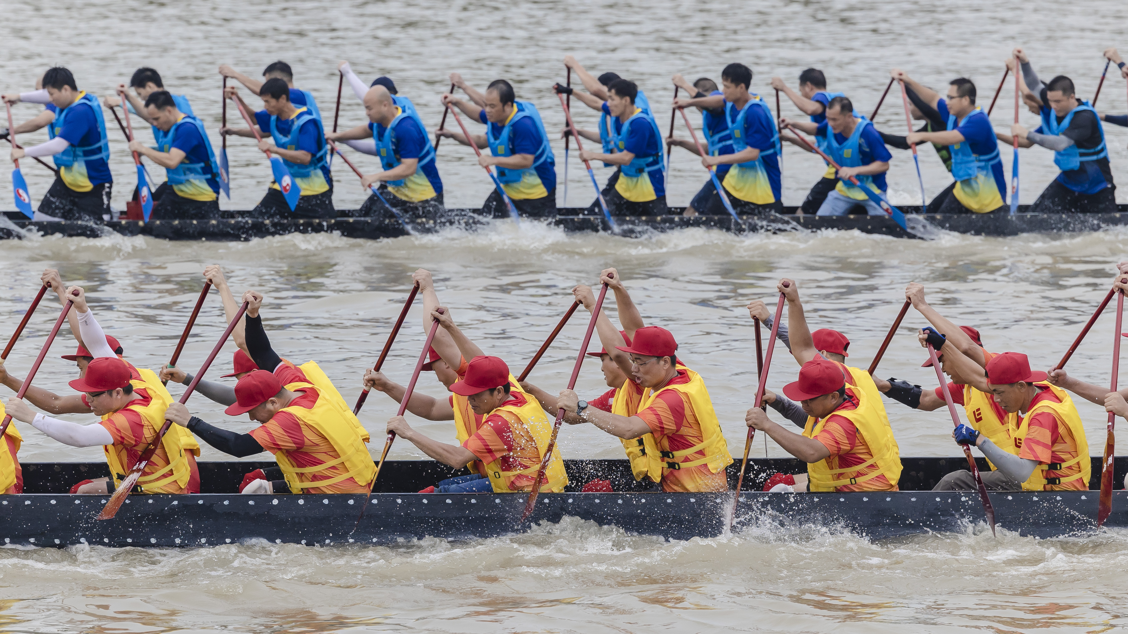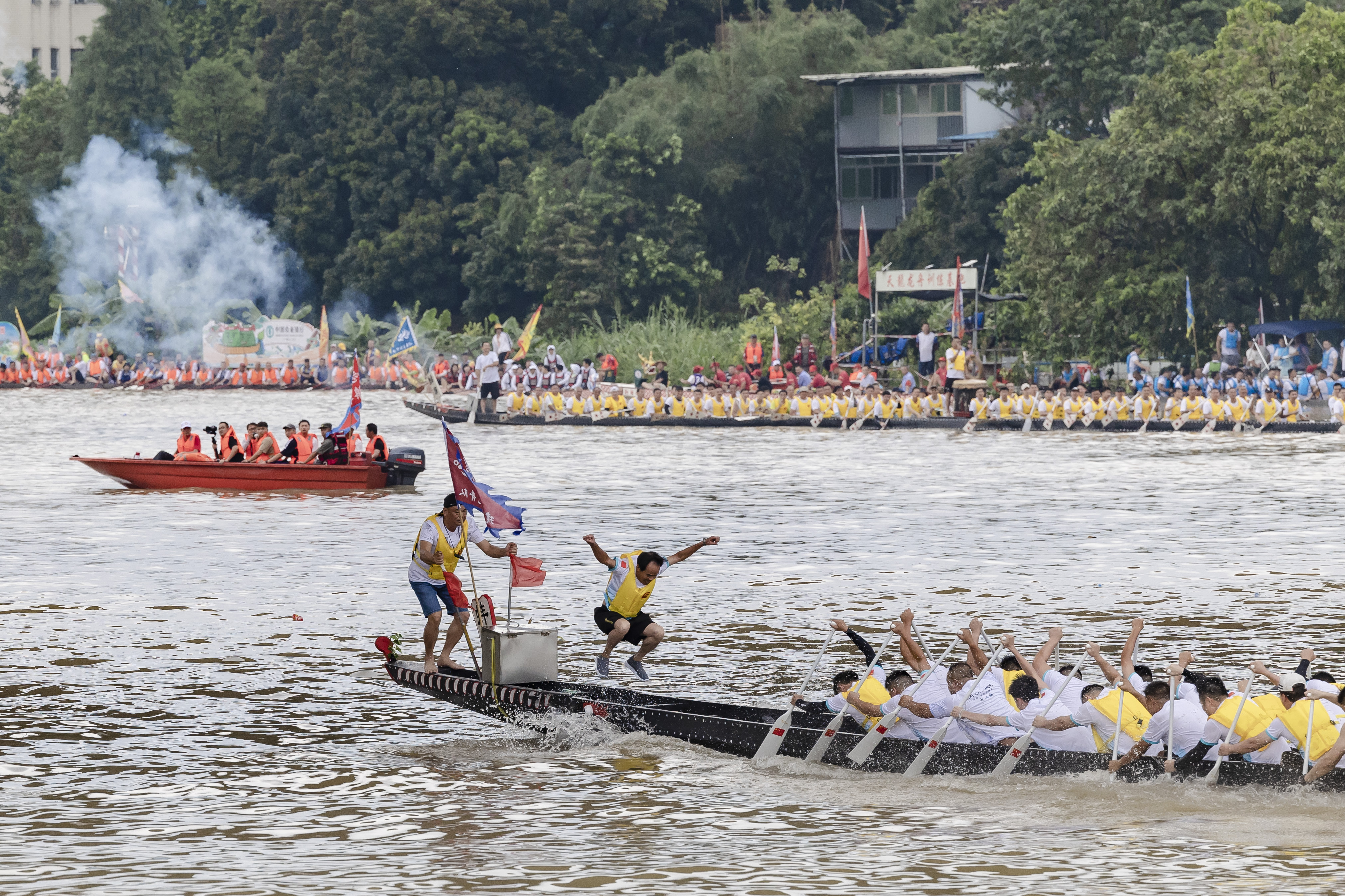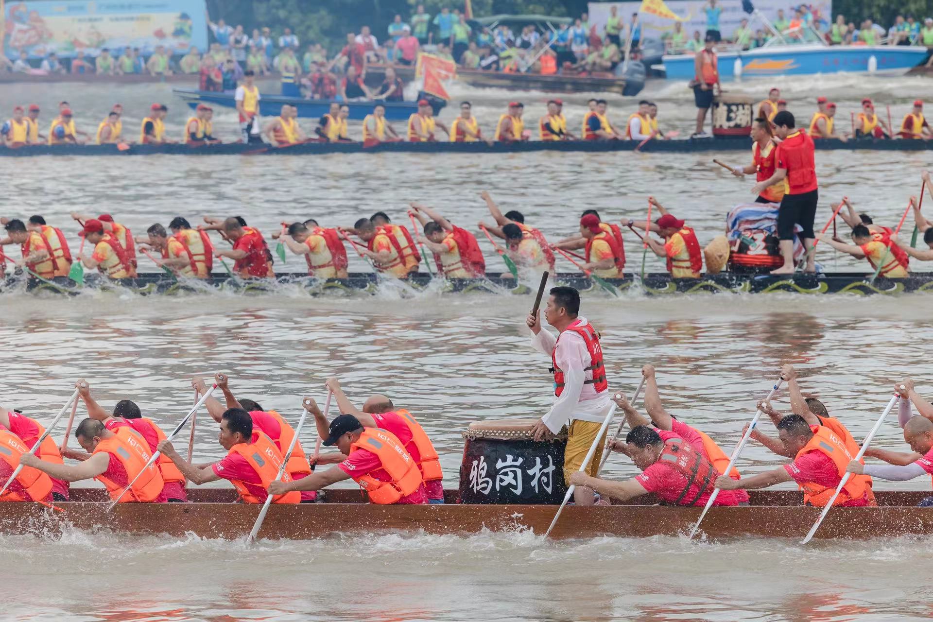下午2时左右,2023年人和镇“龙舟文化周”系列活动拉开序幕。首场“蚌湖景”为龙船自由竞渡、彩龙巡游。除了鸦岗和蚌湖地区的龙船外,人和、石马、高增、鸦湖等兄弟村的龙船也前来参与,足足有近30条龙舟。大家交流切磋,挥浆斩浪,奋楫争先,吸引了大批村民群众在流溪河两岸围观,呐喊助威。