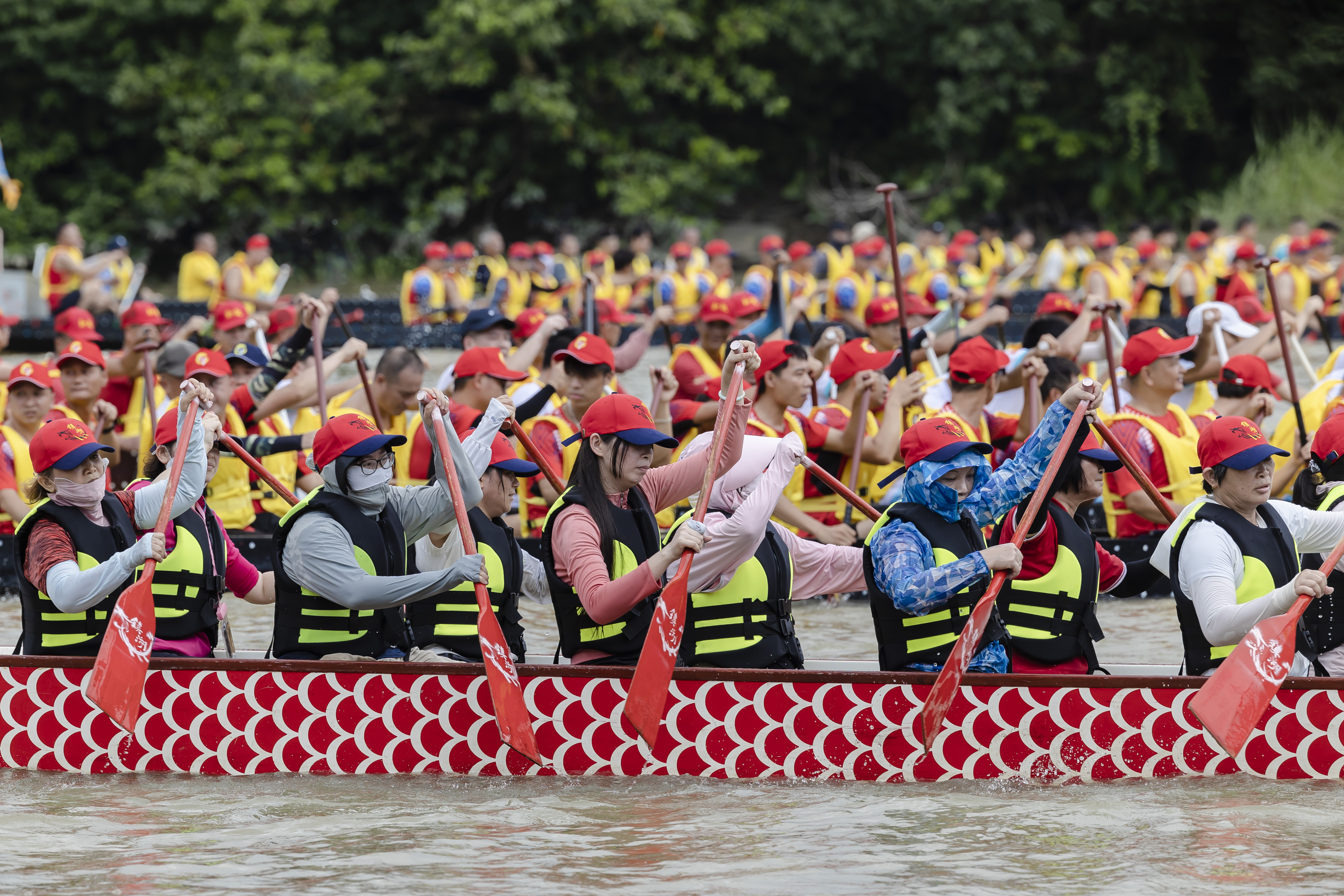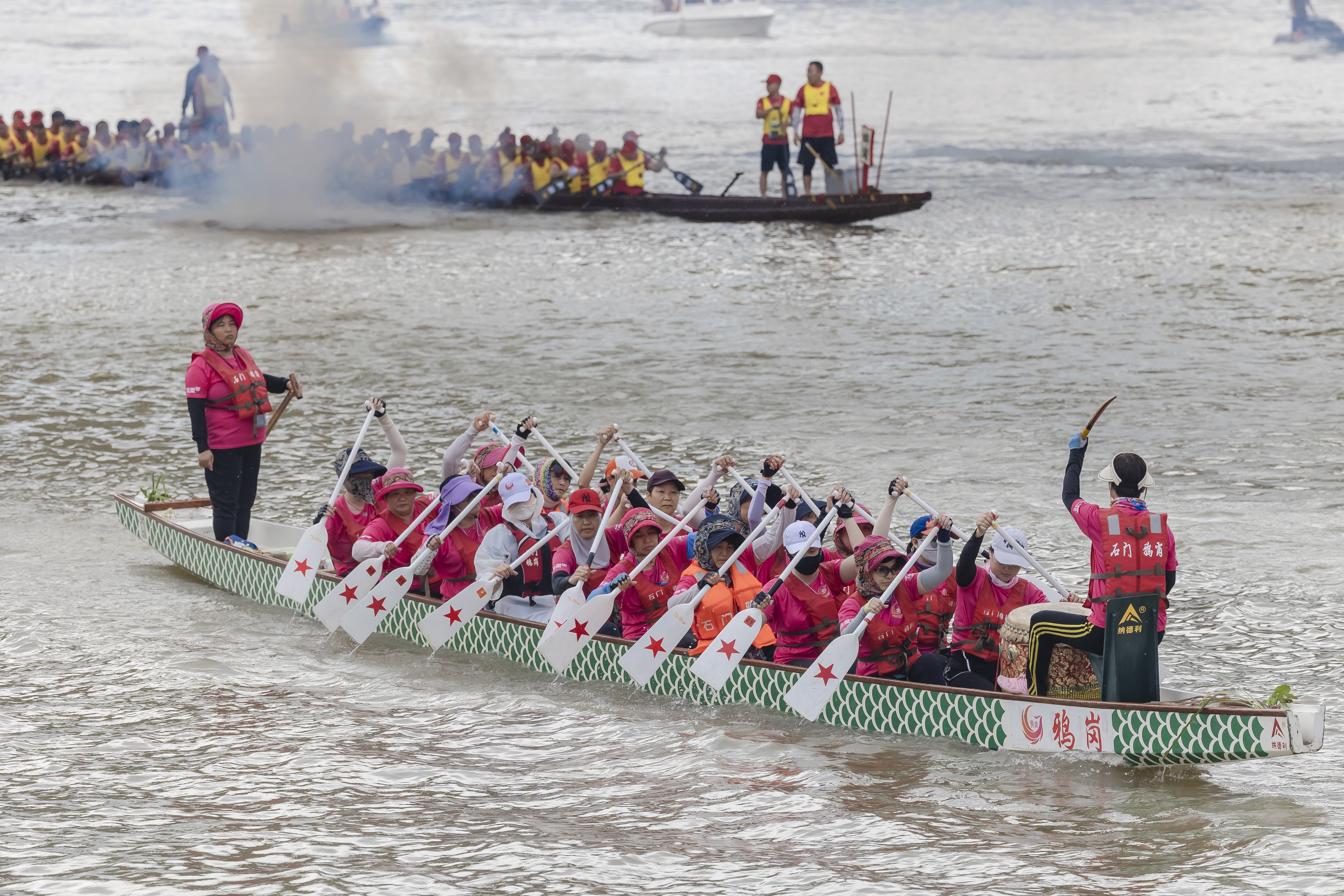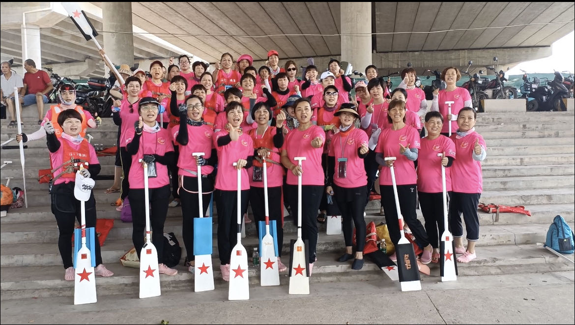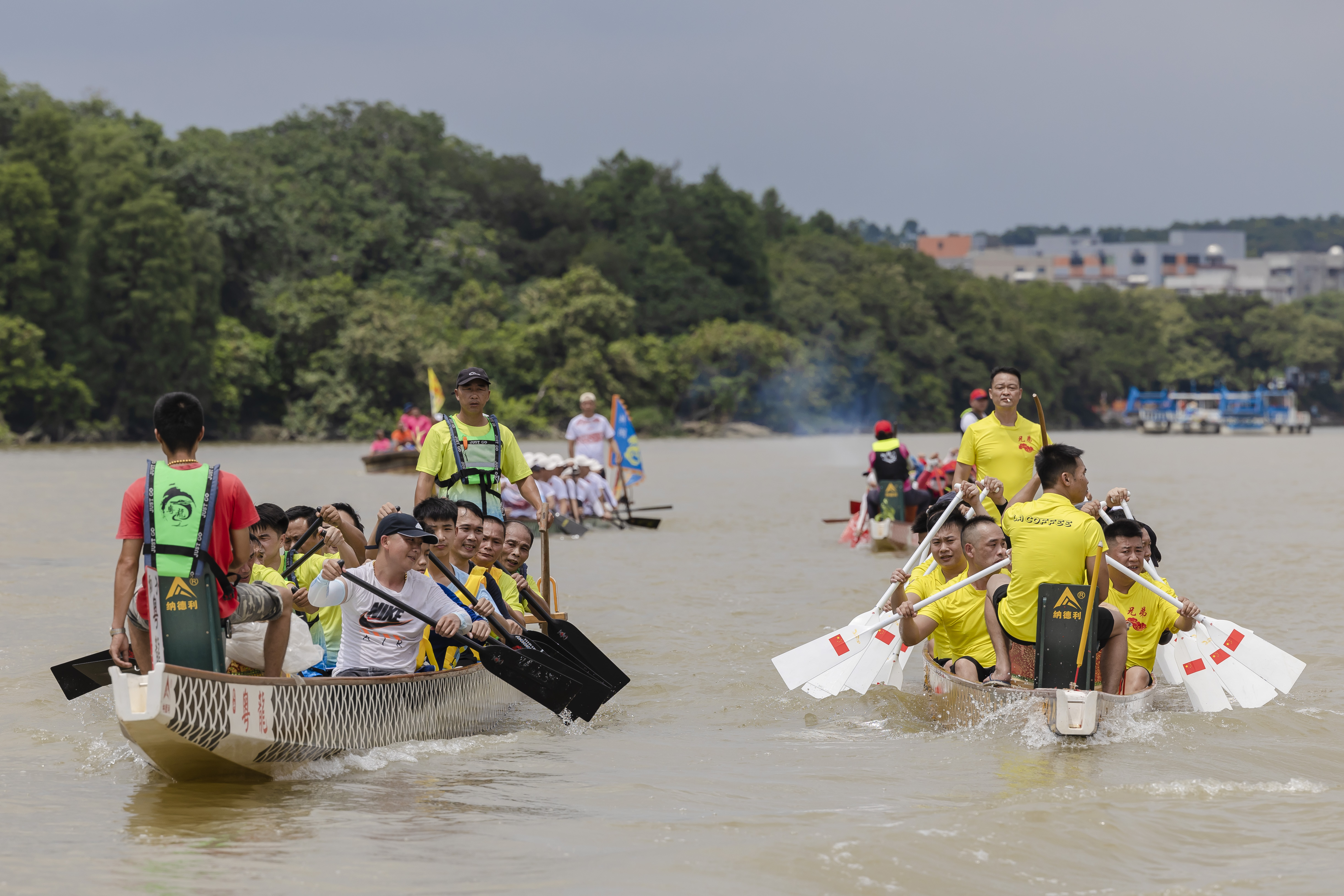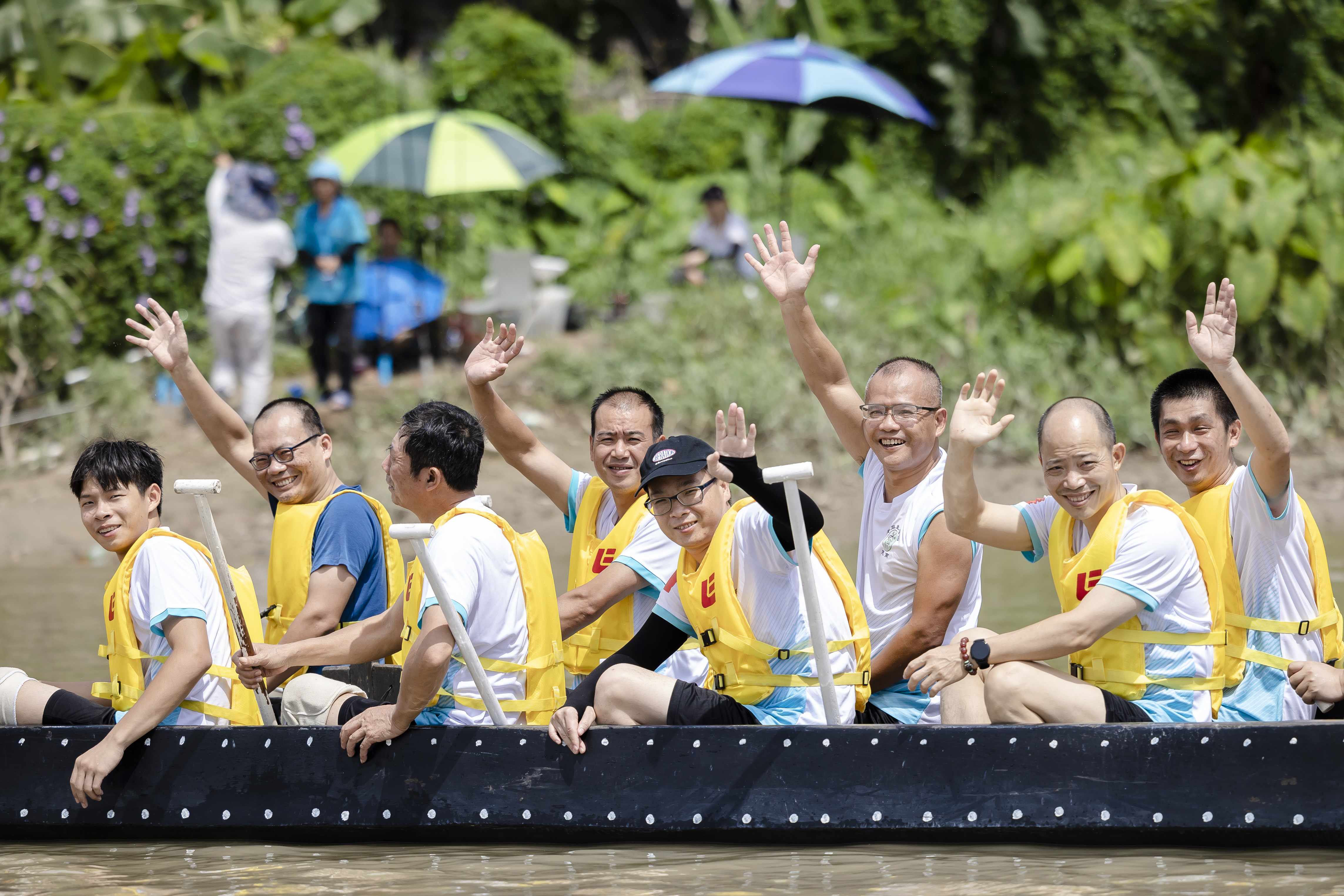船顺着流溪河行驶了一个多小时,开始进入蚌湖河段。龙船未见,先闻鼓声。蚌湖地区7条村的大小11条龙船已在河面恭候多时,只见蚌湖“扒仔”们齐齐发力,边打鼓边吆喝着朝大船划来。“鸦岗乡亲好”,蚌湖女子龙船亦热情问候鸦岗乡亲。