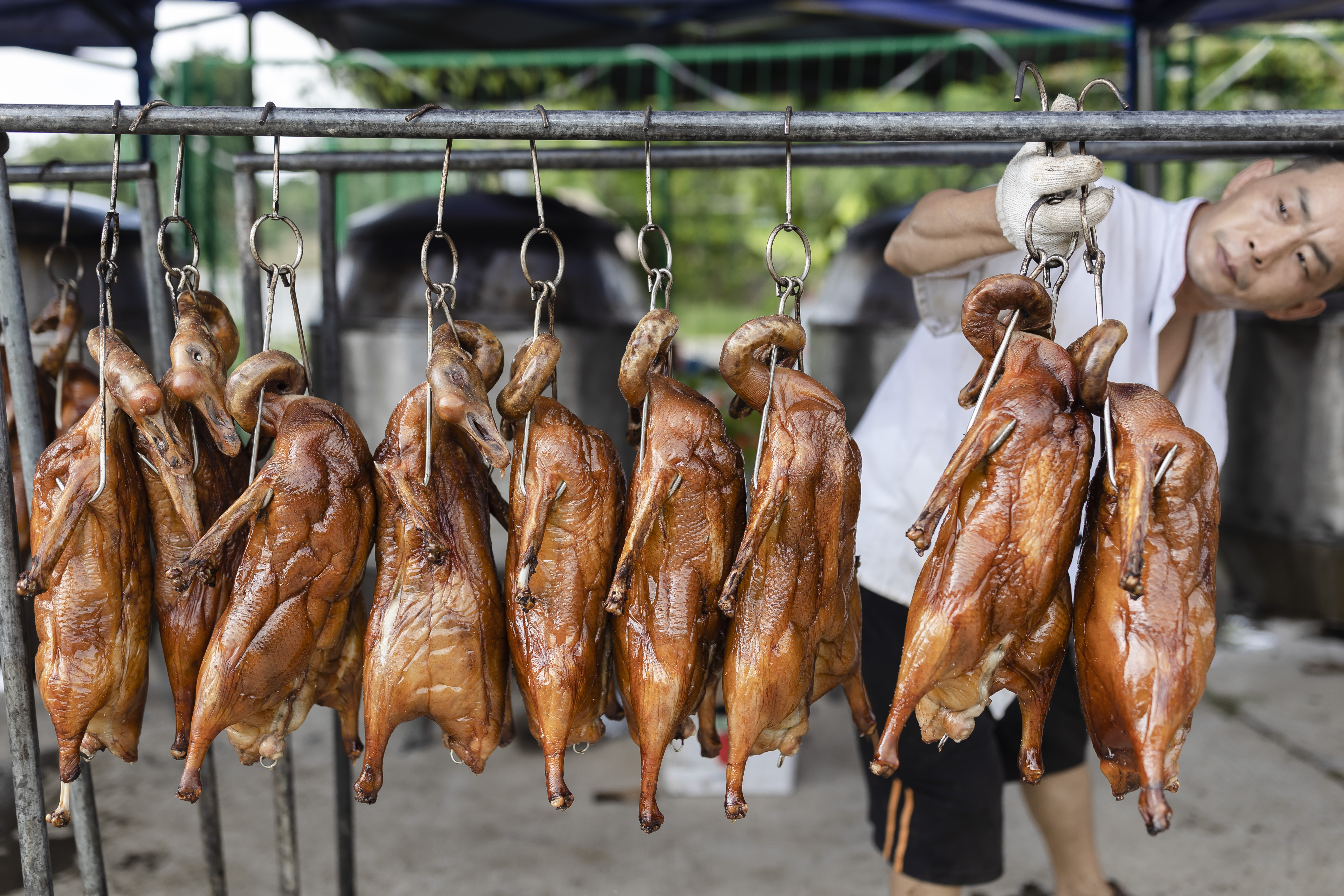 “这些年随着各村经济实力的变化,龙船饭的菜式越来越丰富,但是脆皮烧肉、辣椒头菜花肉这两道菜始终是保留例牌菜。”人和镇横沥村村民沈惠文介绍,端午时节经常下雨,扒龙船免不了淋雨,辣椒用来祛湿,头菜谐音“头彩”,吃“辣椒头菜花肉”健康开胃,寓意“得头彩”;“脆皮烧肉”则因为其外形“红皮赤壮”,寓意皮肤红润,健康壮实。
