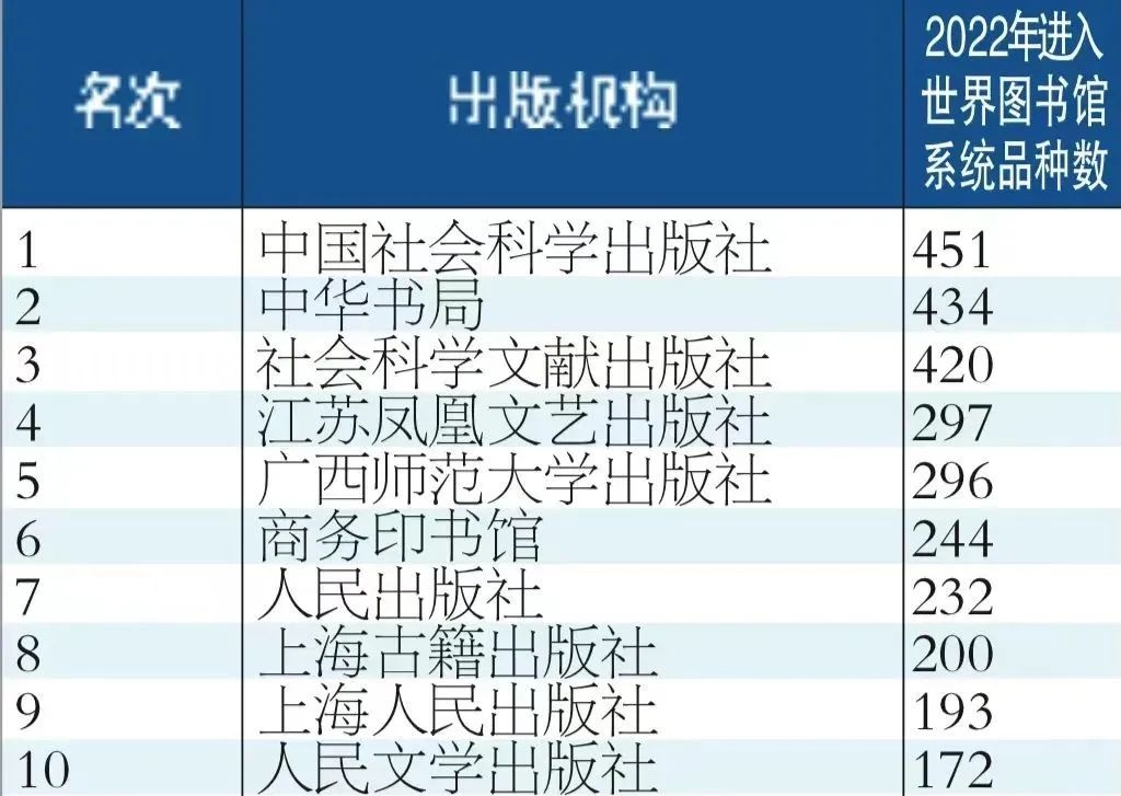 中文图书的海外馆藏影响力,是中国出版世界影响力研究的一个组成部分。在2023年度出版机构百强榜的名单中,人文社科综合实力大社仍然占据第一方阵,前5名分别是中国社会科学出版社、中华书局、社会科学文献出版社、江苏凤凰文艺出版社、广西师范大学出版社,均为去年排名前10的知名大社。