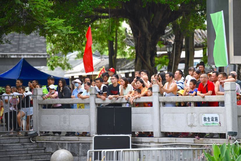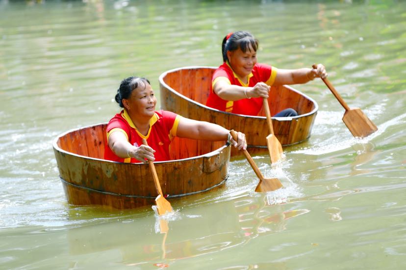 “发斗”表演逗人发笑。“扒发斗”就是“扒禾桶”。发斗看上去简单,就是一个圆桶而已,但是真正运动起来就很难。因为它没有着力点,用力不均就会360度的旋转,掌握不好要么就掉入河中,要么就水面打转。正因为它的特殊性和趣味性,赢得了观众的欢笑声和喝彩声。