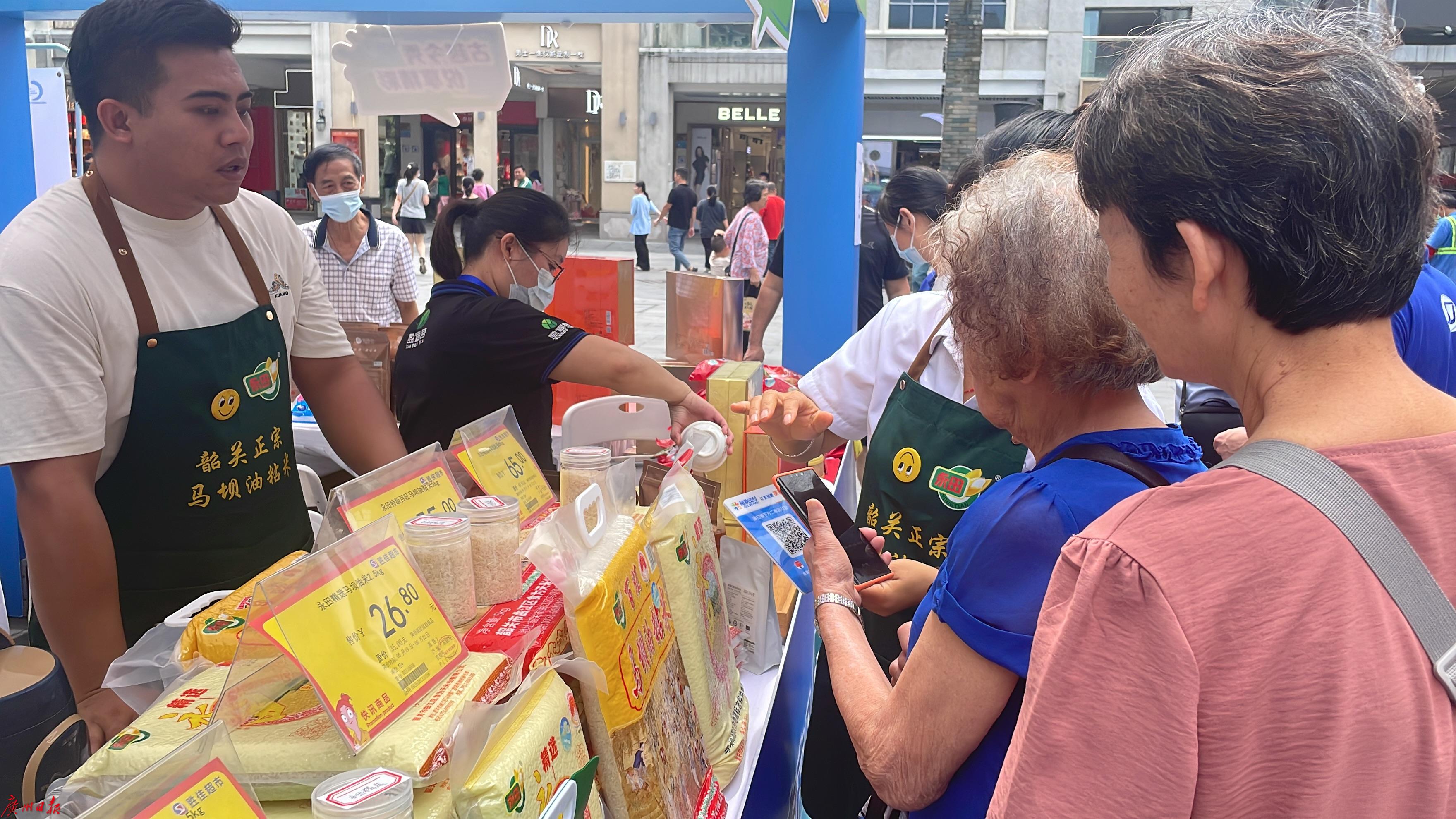 展销区中,广百百货、友谊商店、华润万家、朴朴超市、胜佳超市和中洲农会等各大商超带来种类丰富的地理标志产品,有的还进行直播带货。“我们带来了20多个地理标志产品,包括增城丝苗米、马坝油粘米、阳江豆豉等等。今天(19日)还进行直播带货,0.99元可以买到400克马坝油粘米。”胜佳超市总经理麦家应表示,马坝油粘米很受老广们欢迎,高峰时一家门店一天能售出数百袋。除了在北京路的展销区外,全市有30多个门店也设立了地理标志销售专区。此外,超市的线上小程序也在首页设置专栏销售地理标志产品。