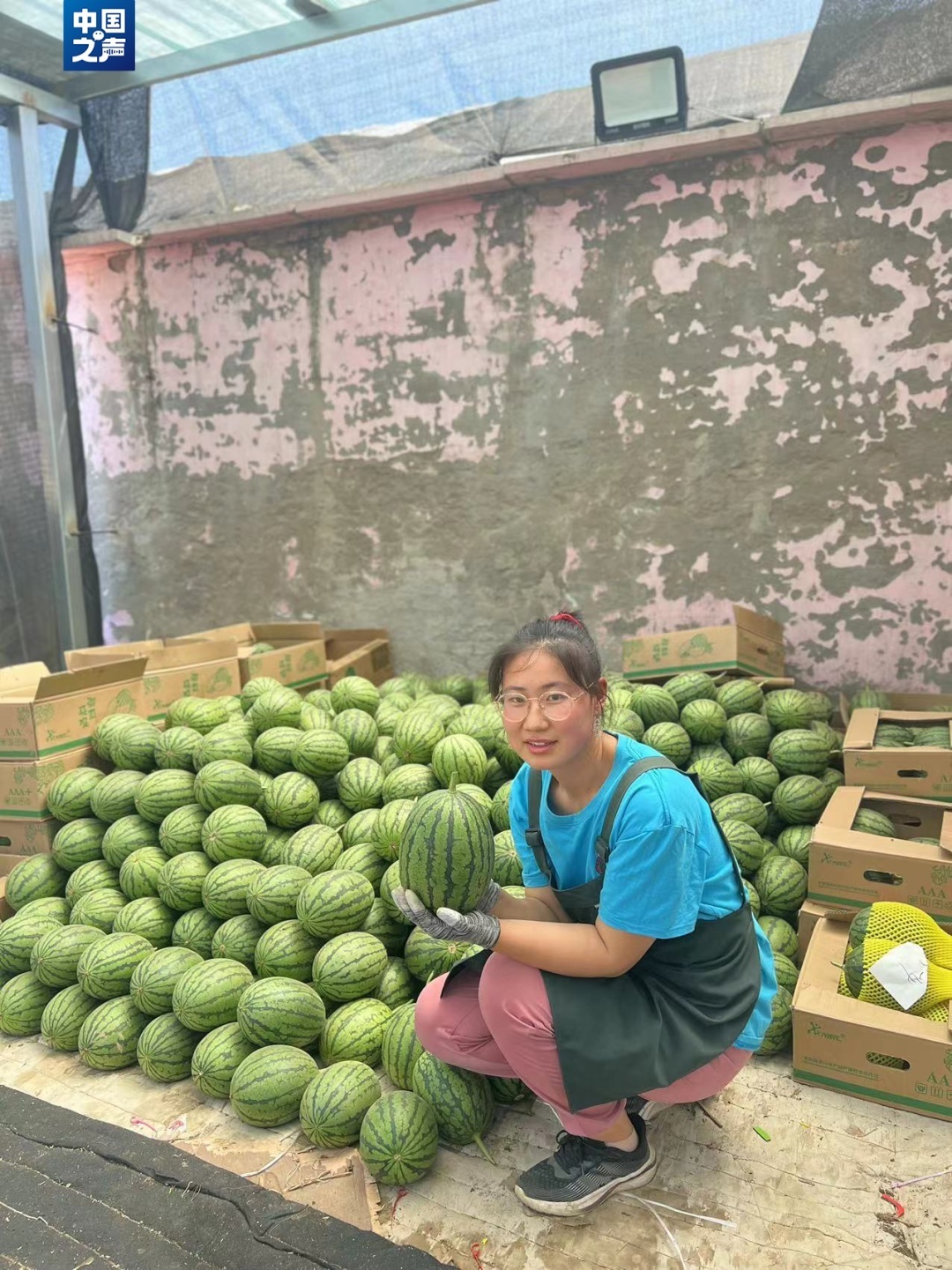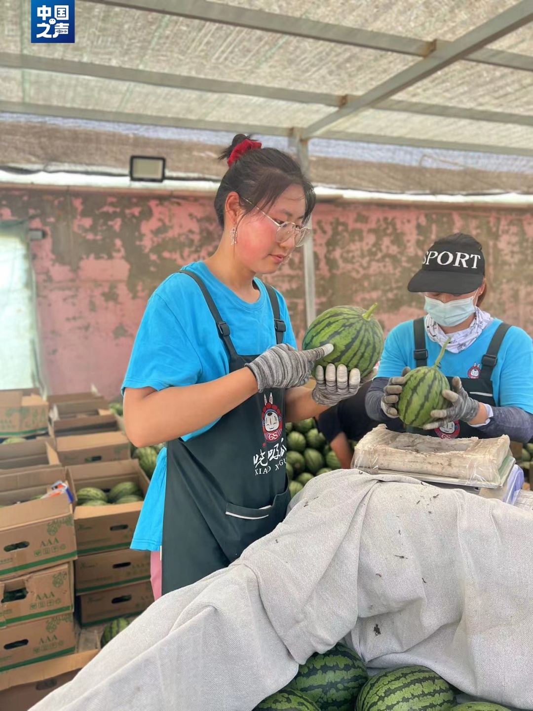 早上7点,在货车的喇叭声中,一箱箱西瓜正在瓜棚中过秤准备出货,这些西瓜都是刚刚从瓜园里摘下的。半人高的西瓜堆前,一个脸颊红扑扑、额头上还挂着汗珠的高个子姑娘戴上手套开始了一天的工作。拍瓜师张灵慧向记者介绍,拍瓜的声音响亮就说明是熟瓜,生瓜的声音则比较清脆。