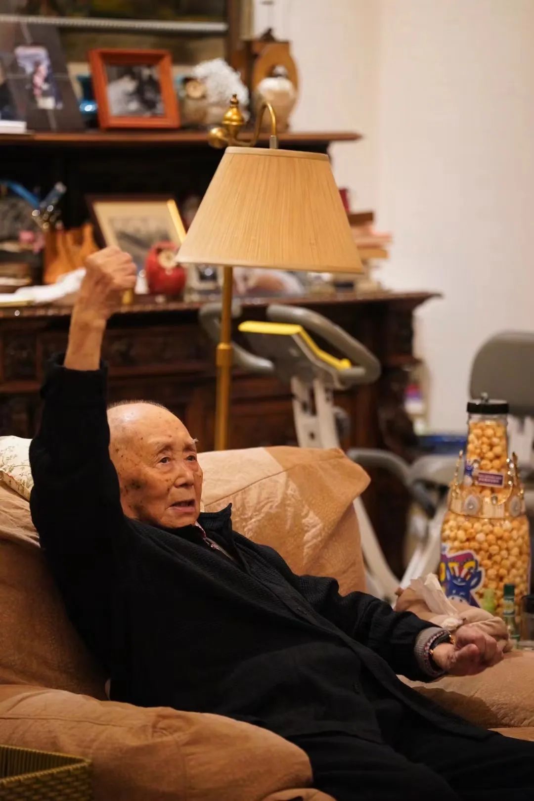 黄霑左手掌指着王世襄,回头看着我,不知怎么回事。
