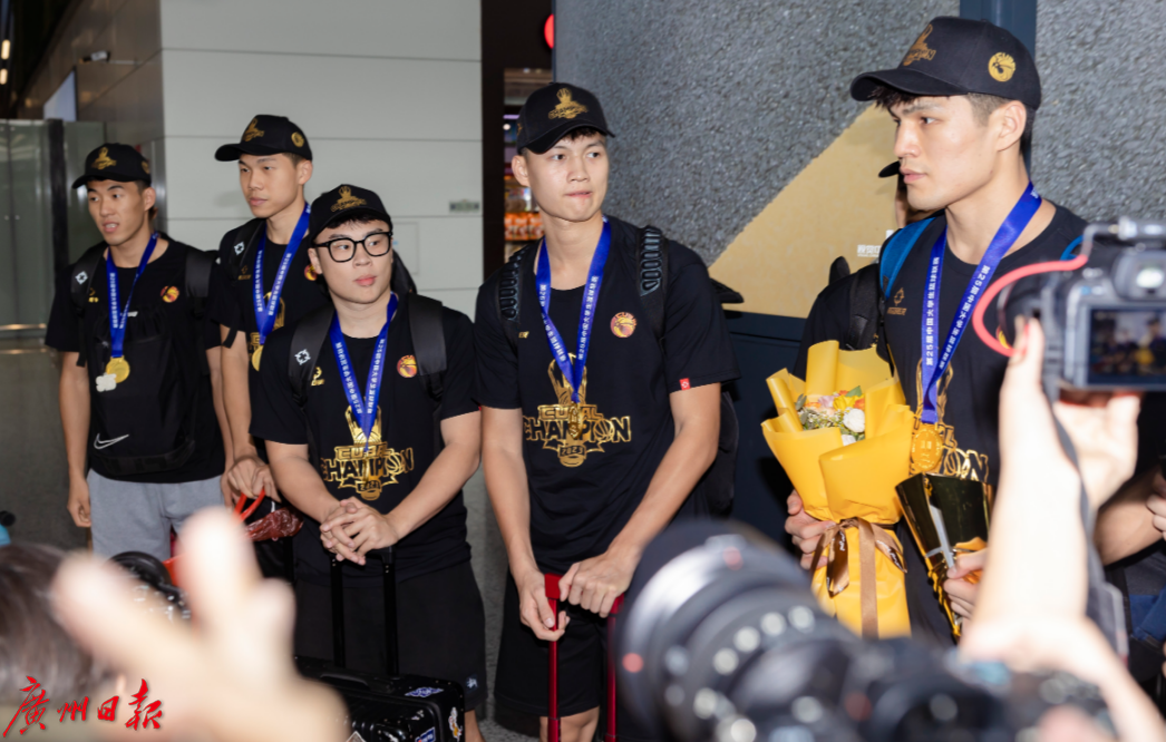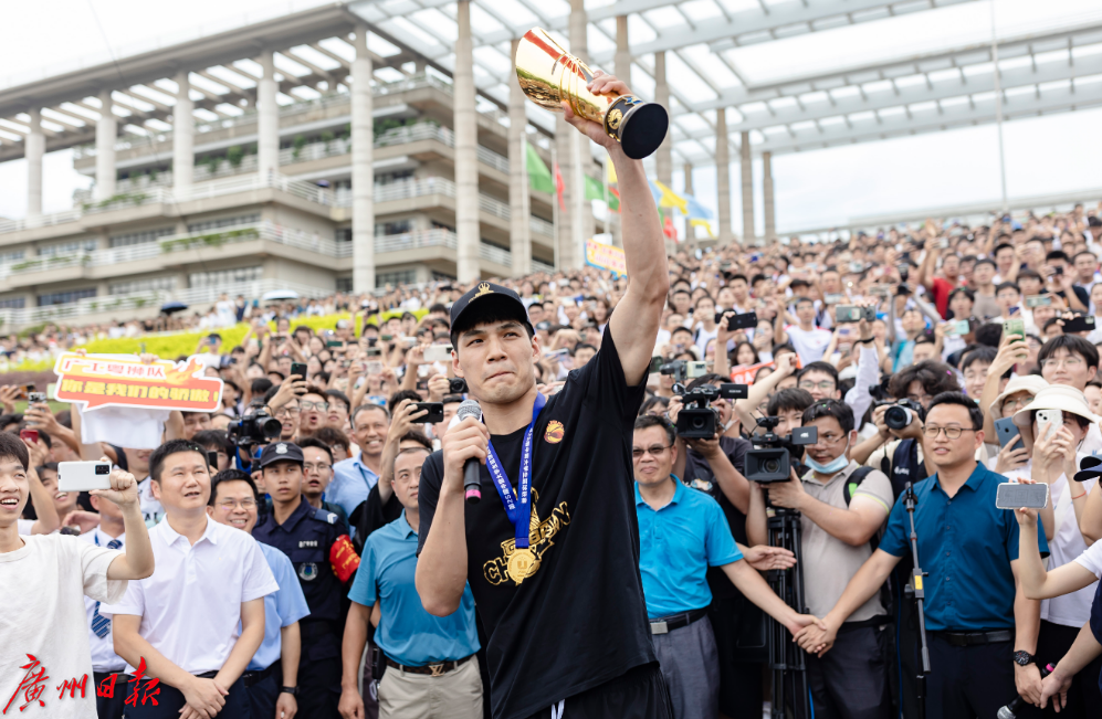 6月19日,广工男篮凯旋。球队在广州白云国际机场和广工大学城校区,受到学校师生热烈欢迎。掌声、鲜花、呐喊、欢呼扑面而来,而上届亚军广工男篮在过去一年里,为冠军付出得比以往更多,练得比以往更“狠”。