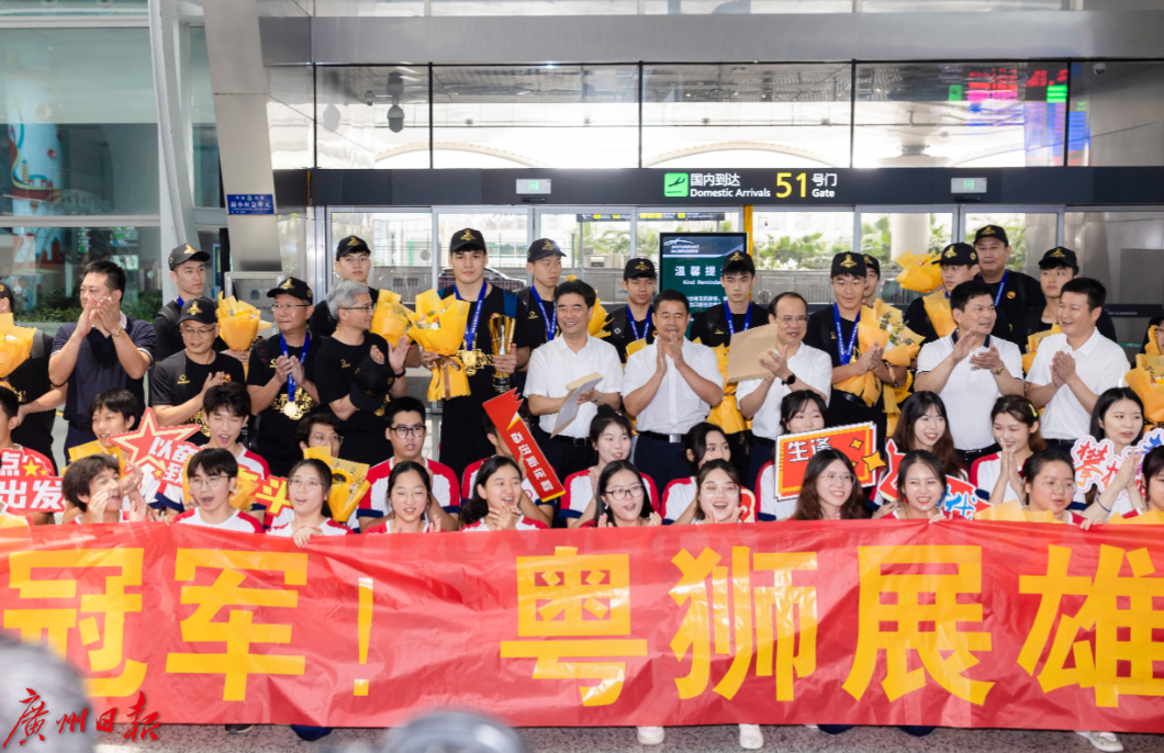 6月19日上午,广工男篮乘坐飞机,预计于11点20分抵达广州白云国际机场。11点不到,学校数十名学生已在机场航站楼拉起横幅,手捧鲜花,准备迎接冠军归来。来自广工的同学早早在航站楼到达出口等待,他们手持手机和摄像机,想在第一时间把冠军凯旋的画面传递出去。