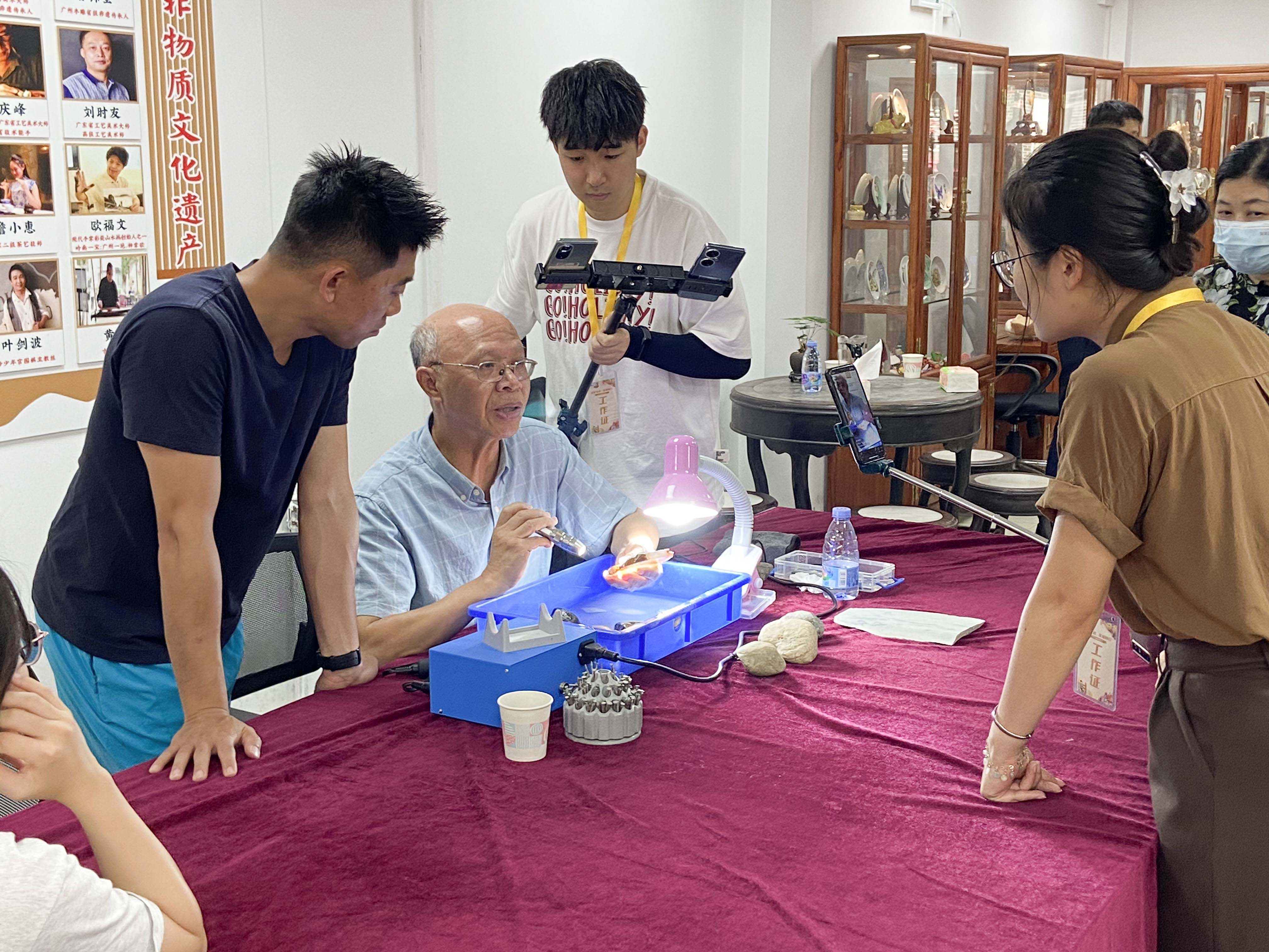 参与本次开放日志愿服务的青年学生穿梭于各大非遗开放点中,探访非遗项目的传承阵地,与非遗传承人深入交谈,以专业的志愿服务为广州非遗的传承、弘扬保驾护航,注入新生活力。参加“活力晓港 细品广彩”开放日活动的侯瀚林、参加“非遗武术《峨眉拳》公益普及”开放日活动的郑世艾、参加“广东醒狮研学”开放日活动的陈昱沁等学生,更是发挥青少年的生力军作用及新闻与传播专业经验,利用个人新媒体账号对开放点活动进行现场直播或创意短片拍摄,以人民共享非遗的角度向广大群众展现、传播广州非遗开放日多点开花的活动盛况,使广大群众获得了常态化学习非遗、认识非遗、参与非遗的机会,并通过新兴媒体渠道,让更多年轻人听见广州非遗的声音,带动广州非遗在新时代青年中的破圈流行。