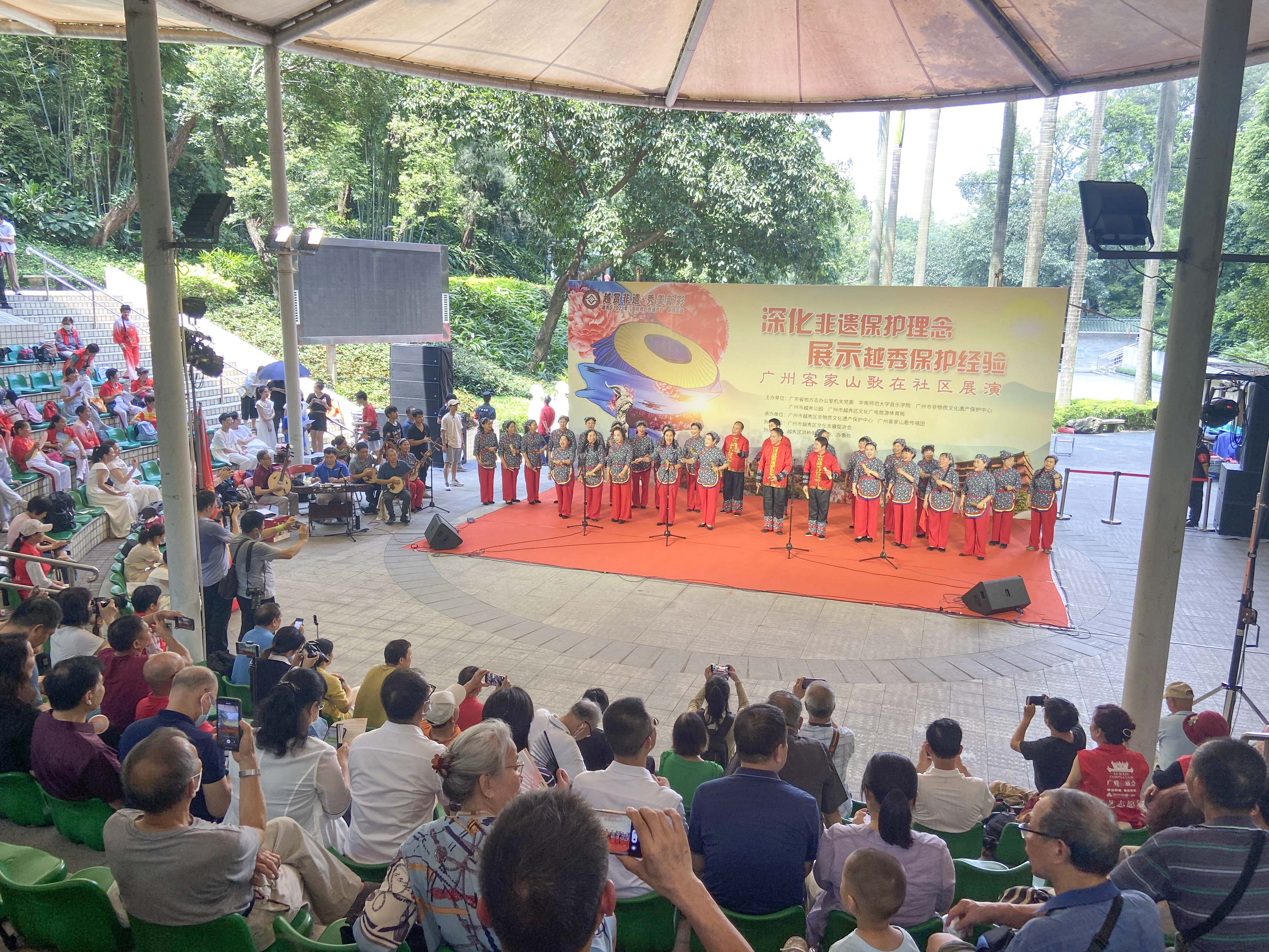 6月12日,“深化非遗保护理念,展示越秀保护经验”2023年越秀区“文化和自然遗产日”非遗宣传展示活动暨广州客家山歌在社区展演活动,地点:越秀公园小天使剧场。