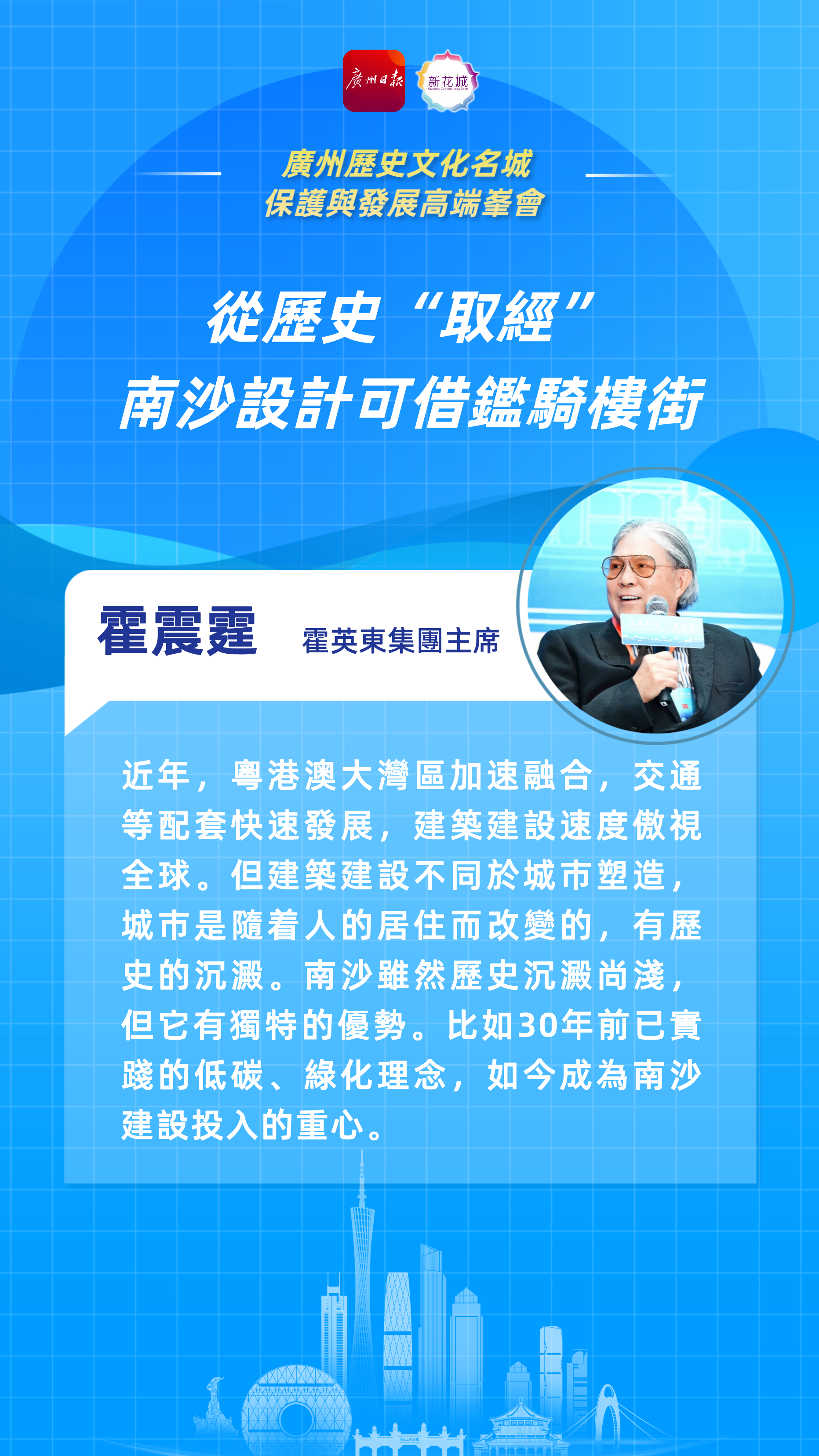 6月19日,在廣州歷史文化名城保護與發展高端峯會上,作為霍英東集團主席、霍英東投資內地建設的見證者,霍震霆分享了從早年白天鵝賓館到近期南沙發展建設的見解與感受。