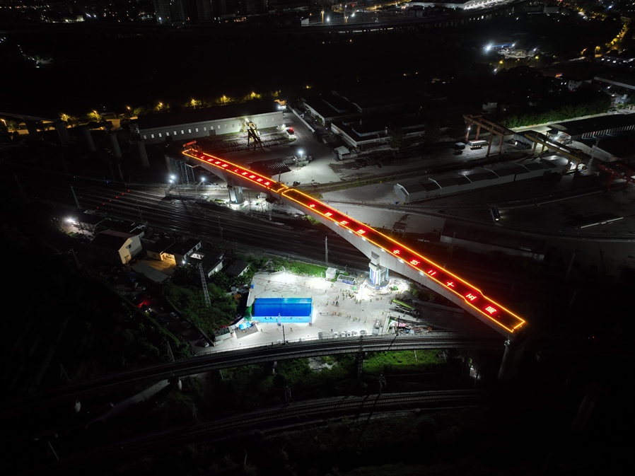 当晚,在夏日星空下,双幅T构转体梁在设备牵引下缓缓旋转,现场技术人员运用计算机程序控制系统全过程监控,凭借实时动态对比,精准控制转体角度和速度,确保封锁“天窗”点内完成转体施工。