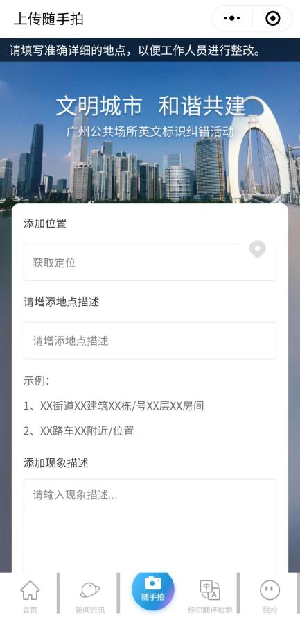 发现错误的英语标识,市民可拿起手机拍下图片/视频,上传到“广州公共场所英文标识”小程序。具体操作如下:长按识别二维码(或微信搜索“广州公共场所英文标识”小程序),进入小程序;点击首页“随手拍”,根据提示填写信息、上传图片或视频。