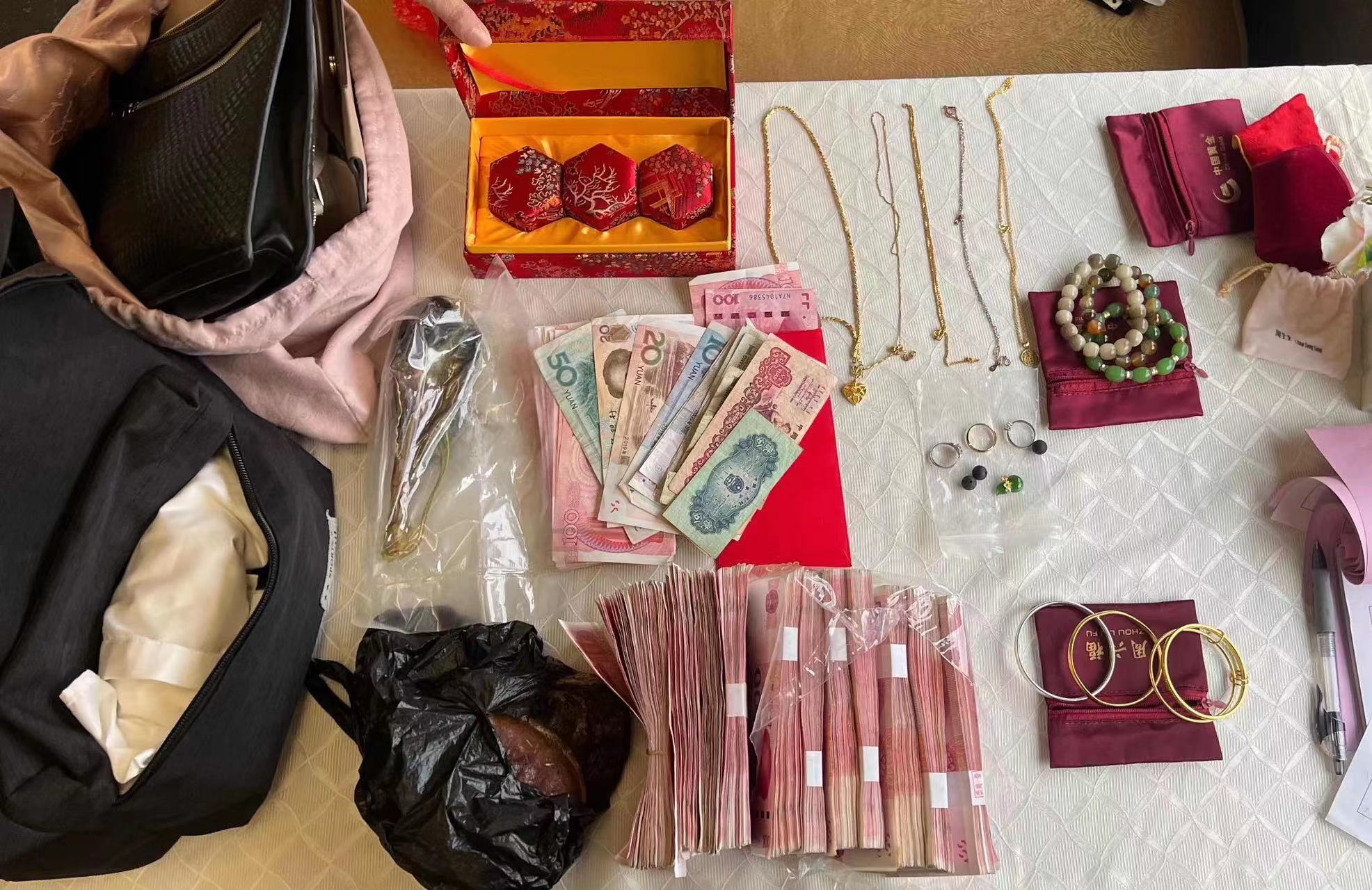 来到餐车,唐秋炬轻轻拉开背包拉链,将外层的衣物和日常用品拿出来后,只见下方整整齐齐地码放着10沓百元大钞,还有金银珠宝首饰。经过一番清点,包内共有现金105319.3元,金手镯、项链、戒指共11件,珠宝吊坠、手串2件,名贵药材若干,预估总价值近15万元。