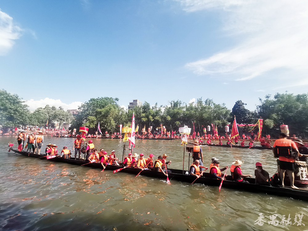 下午3时,在员岗村的河道上,各村共10多条龙舟在龙舟健儿整齐划一的动作带动下,在水面上争先竞渡,飞舞驰骋。两岸观看的群众不断地为龙舟健儿呐喊助威,在罗伞、彩旗和阳光的映衬下,锣鼓声、欢呼声、呐喊声,此起彼伏,响彻整个员岗村,现场气氛十分热烈。