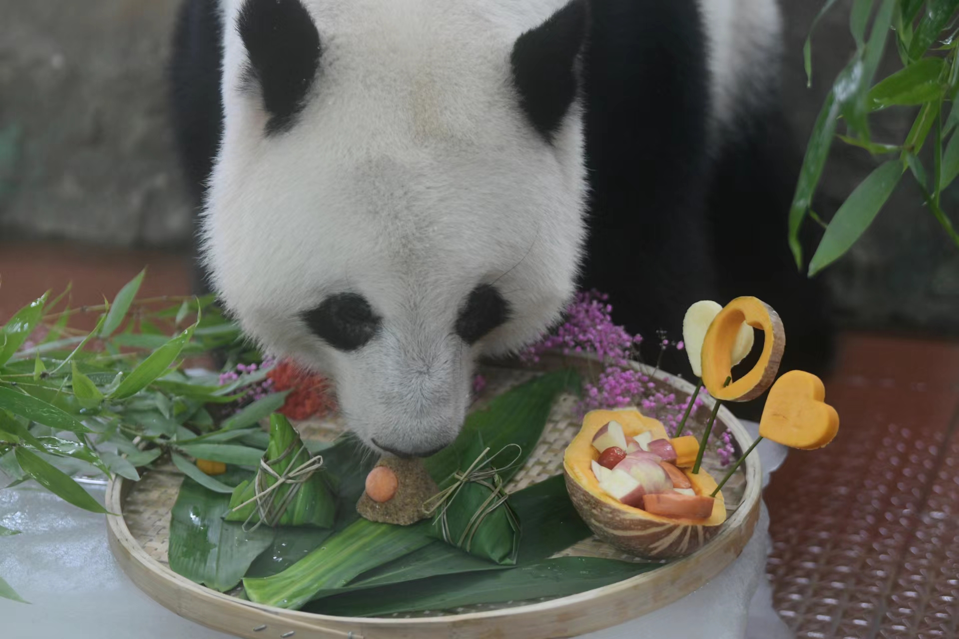 大熊猫怎么过端午?当然是吃粽子啊!端午节,广州动物园为熊猫星一和雅一送上“粽子”和冰块,让它们在大快朵颐的同时也能消暑。
