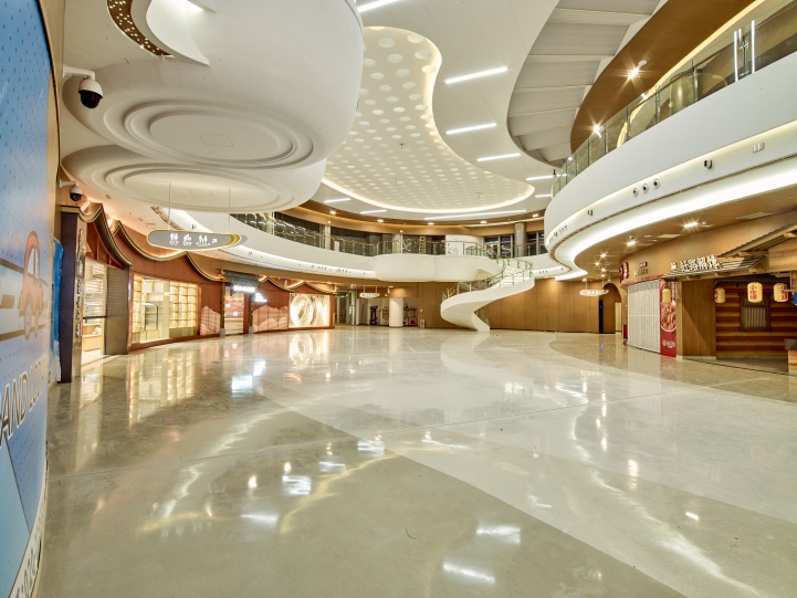 新阳江服务区服务楼外观设计为帆船形状,外立面采用大体量的玻璃幕墙,增加室内自然采光效果。酷似“鲨鱼嘴”造型的飘蓬即为服务楼入口,步入服务楼,带有海浪线条的大堂天花顶映入眼帘,月牙形透光孔嵌入其中,灯影缤纷尽显立体和时尚。服务楼地面采用人造石进行弧线拼花,呈现水滴造型,旋转扶梯和跑马廊观景平台形成水滴散开形态。海豚编织灯带、贝壳墙等点缀其中,展现了阳江滨海元素的特色风情。