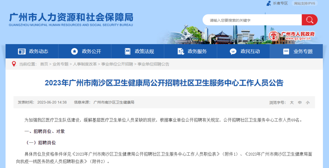 1、广州市人力资源和社会保障局官网(业务专题栏目下的事业单位公开招聘版块);
