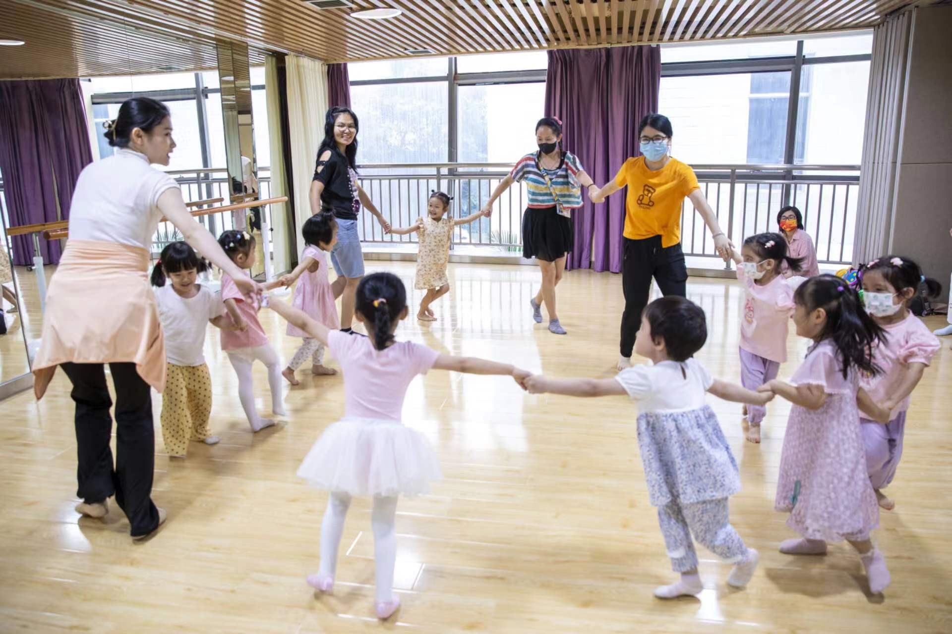 排练室里,少儿舞蹈和戏剧表演艺教课程限时开放体验,合唱公开课开放近距离观摩,许多家长领着孩子穿梭于不同课室之间挨个参与,或唤醒身体律动,或在戏剧游戏中释放表演天性,或感受歌声同频共振的奇妙瞬间。