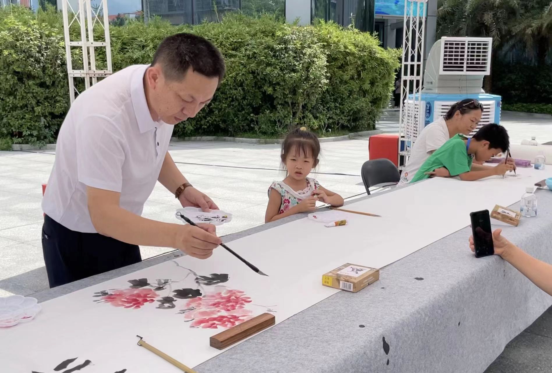不同于首个开放日,今年的活动还从室内延展到了户外空间。广东艺术剧院青少年合唱团启蒙班的孩子们齐聚广场,以快闪的形式同唱经典民歌《掀起你的盖头来》,成为文化厅大院内一道亮丽的风景线。与此同时,户外广场翰墨飘香,广东艺术剧院邀请的书画大师以长轴画为载体,与现场观众展开一次集体即兴创作。