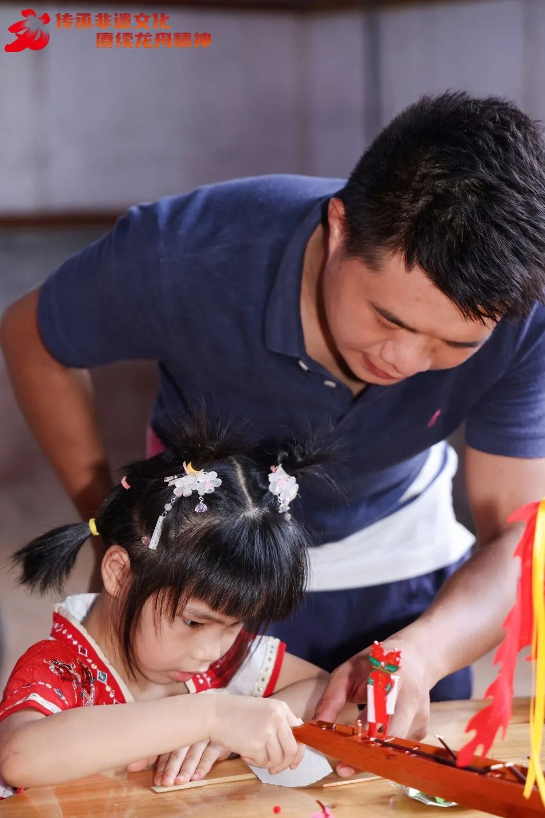 活动现场,南村镇邀请到了番禺区石碁镇永善龙舟文化工作室龙舟手作师傅张剑辉。张剑辉从小痴迷手工制作龙船模型,所制作出的龙船模型不仅精巧细致、还原度高,甚至还能和真正的龙船一样下水。张剑辉为同学们上一堂龙舟模型课程,手把手教大家做一些龙船里很重要的部件,例如龙舟桨、龙船舷,小朋友们做得不亦乐乎。