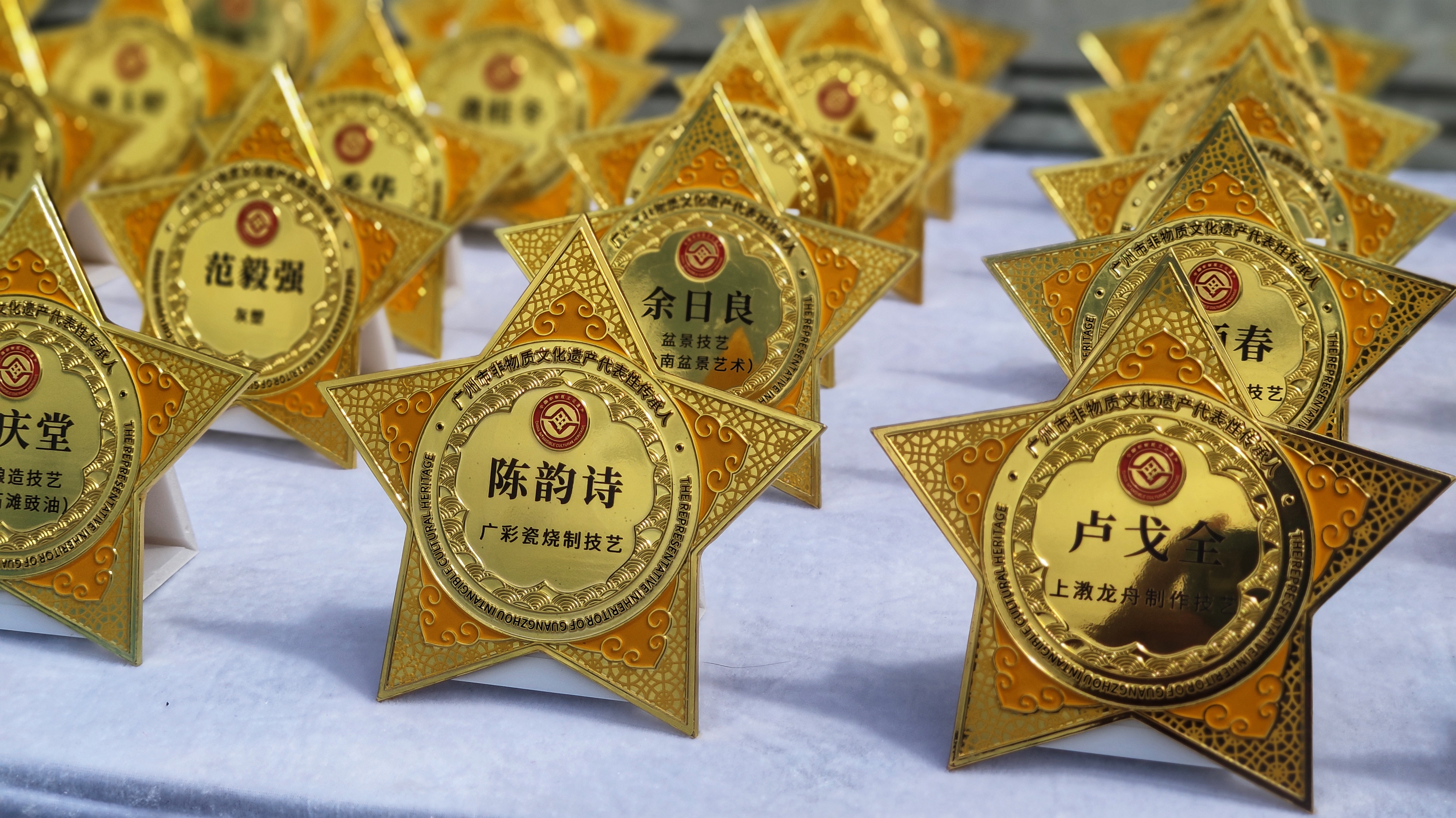 此次除了证书颁授之外,在广州市文化馆中心阁五楼“群星璀璨”展墙还新增了70个“传承人荣誉勋章”,彰显了一代又一代的广州非遗传承人用一生坚守一艺,蓄力接过前辈手中的接力棒,激扬起蓬勃的传承力量的动人场景。