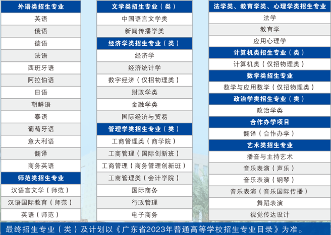 广外今年有59个本科专业有招生计划,招生专业中九成为省级以上一流本科专业建设点。在广东省的院校专业组分组进一步优化细分:普通类(历史)由去年的4个组调整为9个组,普通类(物理)由去年的4个组调整为11个组,均含地方专项计划组;艺术类仍划分为6个组,保持不变。除数字经济、计算机类、数学与应用数学仅招物理类考生,政治学类要求选考思想政治外,其他专业均为历史类、物理类兼招且不限再选科目。
