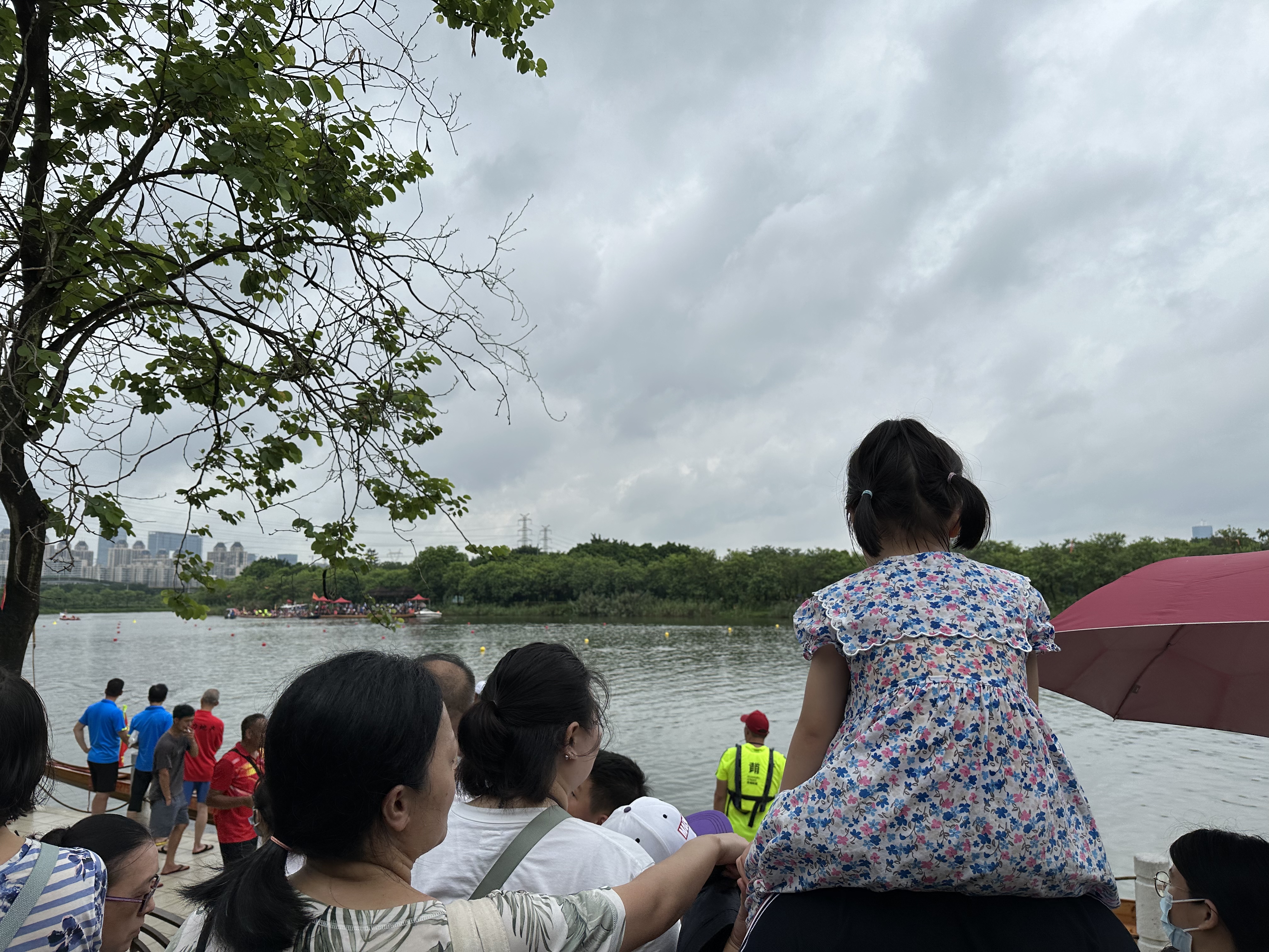 约半小时后,随着雨势渐停,22人公开组比赛正式在14时10分开始。岸边观赛的人群也立即热闹起来——或举起手机拍照,或加油呐喊,或端起长枪短炮瞄准河道中的龙舟。