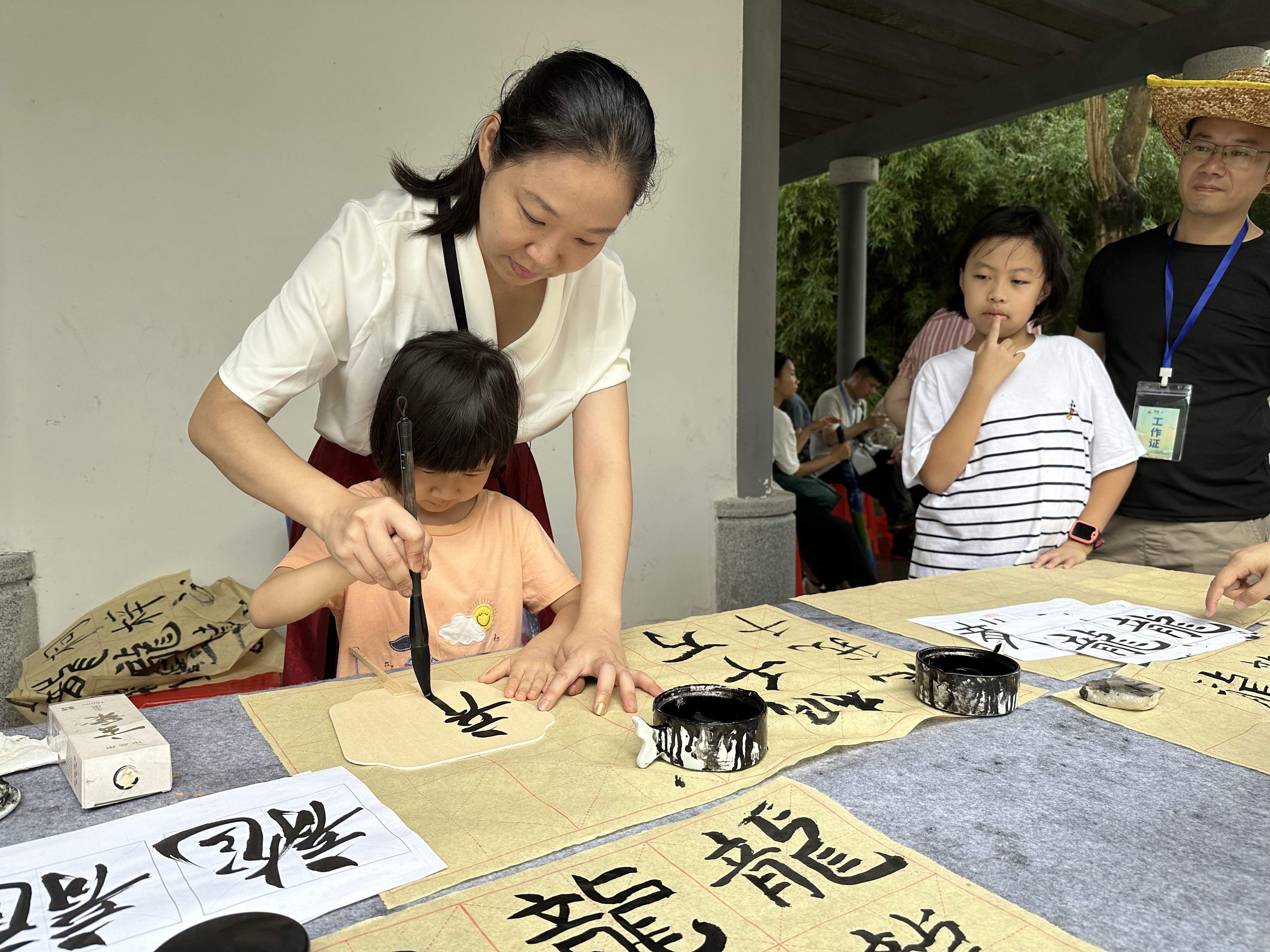 在创意集市附近的书法写龙体验区,展位上挂着十余张龙字的不同写法供免费临摹,不少市民上前挥笔体验。书法老师何文姬表示,书法体验与龙舟活动一动一静互相结合,既是一种书法体验也是对龙舟文化的传扬。