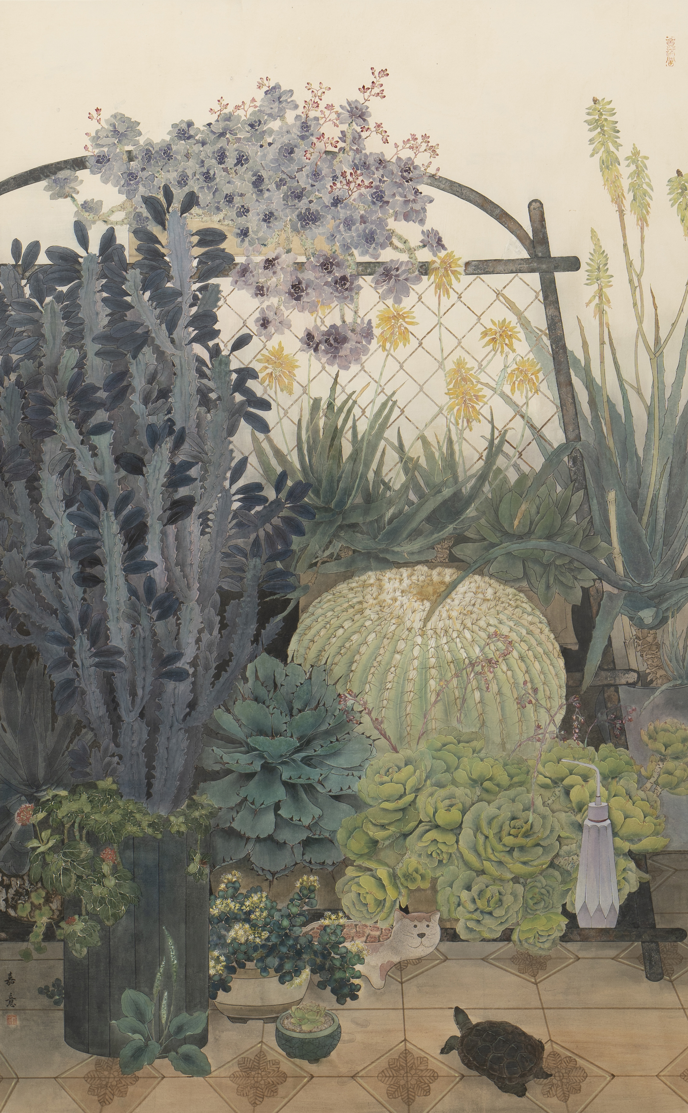 “生活是艺术创作的源泉”这句话,形容广美中国画学院的毕业生刘嘉意的作品很是贴切。这幅高1.8米的大画《绿意空融》呈现的是绿意盎然的阳台一角,这里生长着各式多肉植物,它们的原型是陪伴了作者大学四年生活的阳台“多肉们”。为了丰富创作,刘嘉意去到了广州芳村的花卉市场,还去到了学校附近的居民小巷,收集老广们中意的多肉植物,比如作品中的龙骨,就是岭南院落中常见的多肉植物品种。“多肉植物的生长往往象征着生命,无论在什么地方,它们以块根及叶片中的蛋白质和水分得以生存。棱角和棘刺象征着它们的顽强,对于我来说,是我大学生活中偶尔失落、疲惫的抚慰,也是坚定的陪伴。我想,这就是植物之于普通人的意义。” 刘嘉意说道。