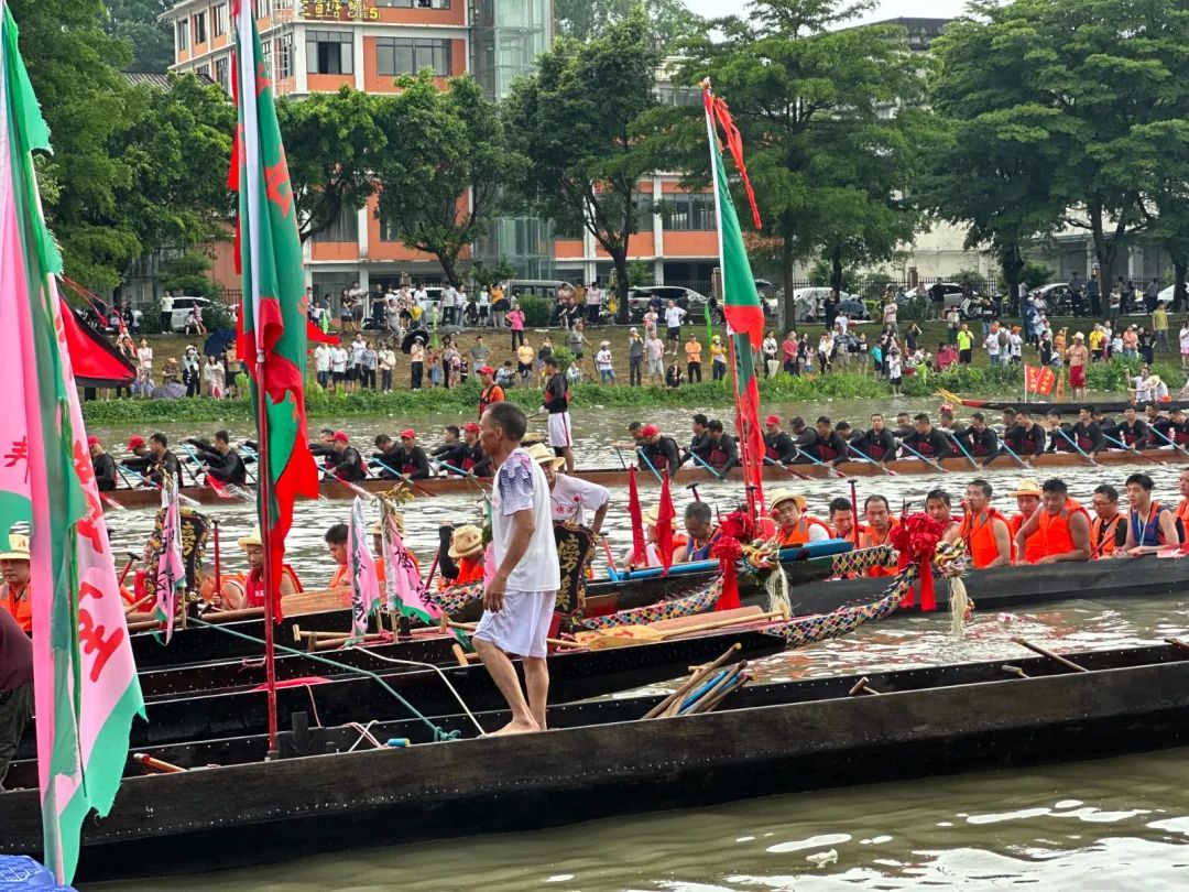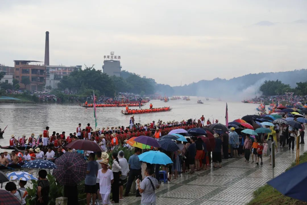 龙船景从下午1点开始,持续到3点结束。60余条龙船在水上竞相争渡,岸上围观的市民纷纷拿起手机拍照,村前门楼披红挂绿,沿河岸边彩旗飘扬,锣鼓声震耳欲聋,现场很是热闹!