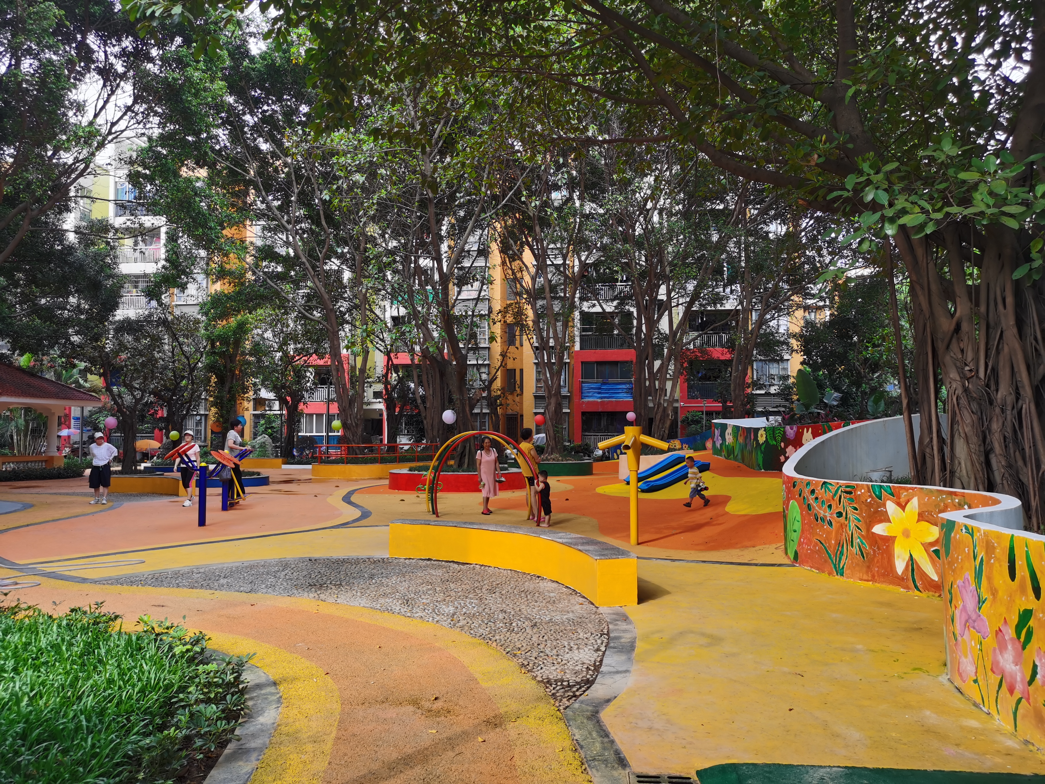 为使老小区焕发新活力,让居民有个更加舒适休闲的环境,珠江租赁经过实地调研,充分听取居民意见,以人文、康养、植物、艺术体系为核心,以家风建设为主题,通过“绣花式”的改造,铺设橙黄相间塑胶地板,绘制各种大自然图案墙壁,增加基础设施、休闲空间、景观小品等,将“立家规、传家训、树家风”文化元素融入整体花园景观,让家风文化慢慢根植保障房小区社区环境中,引导树立传承好家风的正能量社区文化。