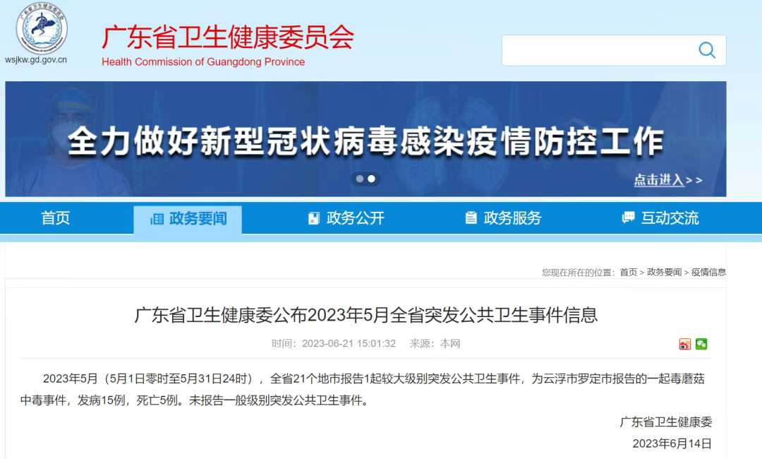 据广东省卫健委最新发布的上月(5月)全省突发公共卫生事件信息,报告一起较大级别突发公共卫生事件,为云浮市罗定市报告的一起毒蘑菇中毒事件,发病15例,死亡5例。