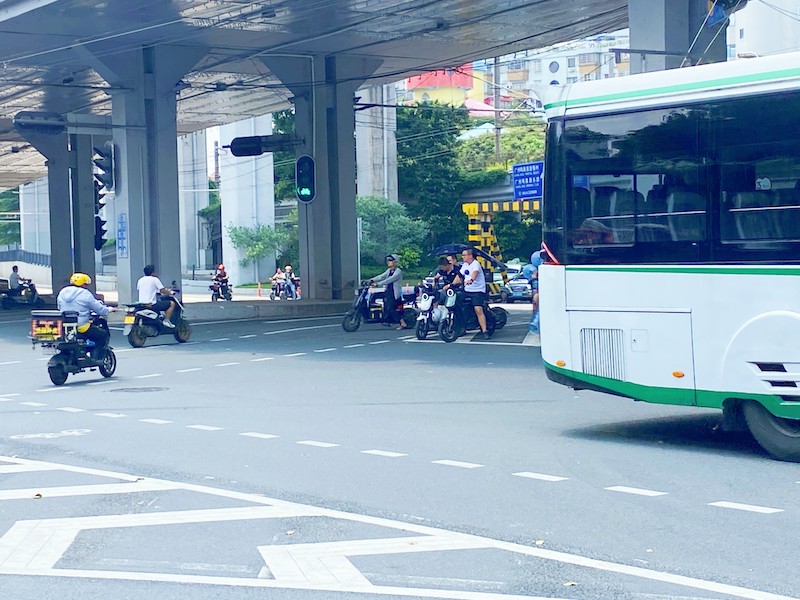 小北地铁站附近,有些市民骑行电动车时没有佩戴头盔,并前行到路中等待红灯