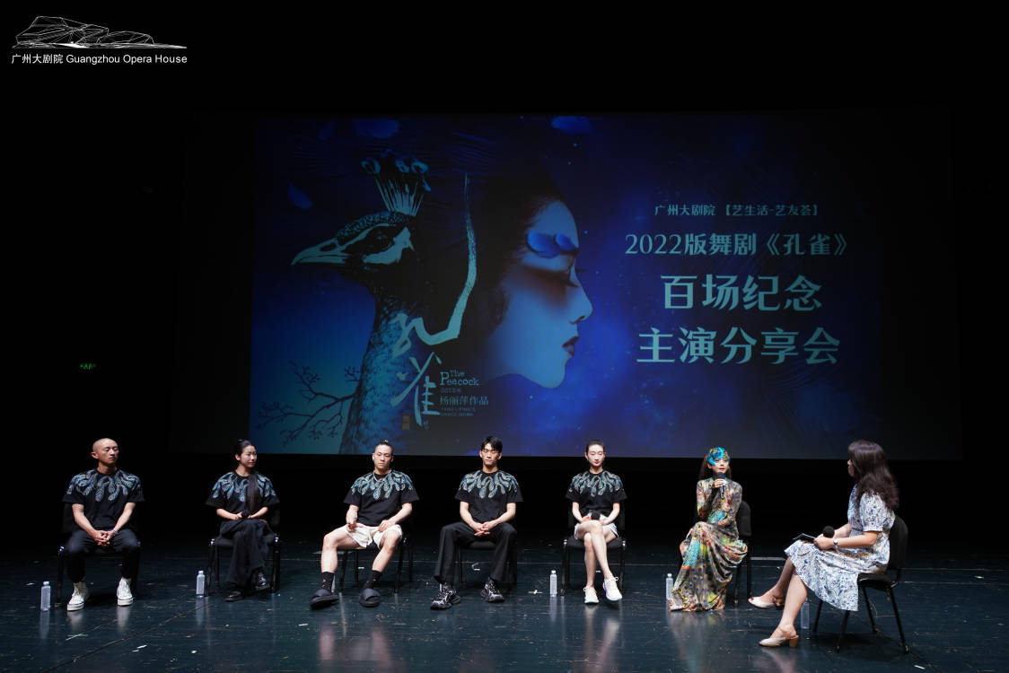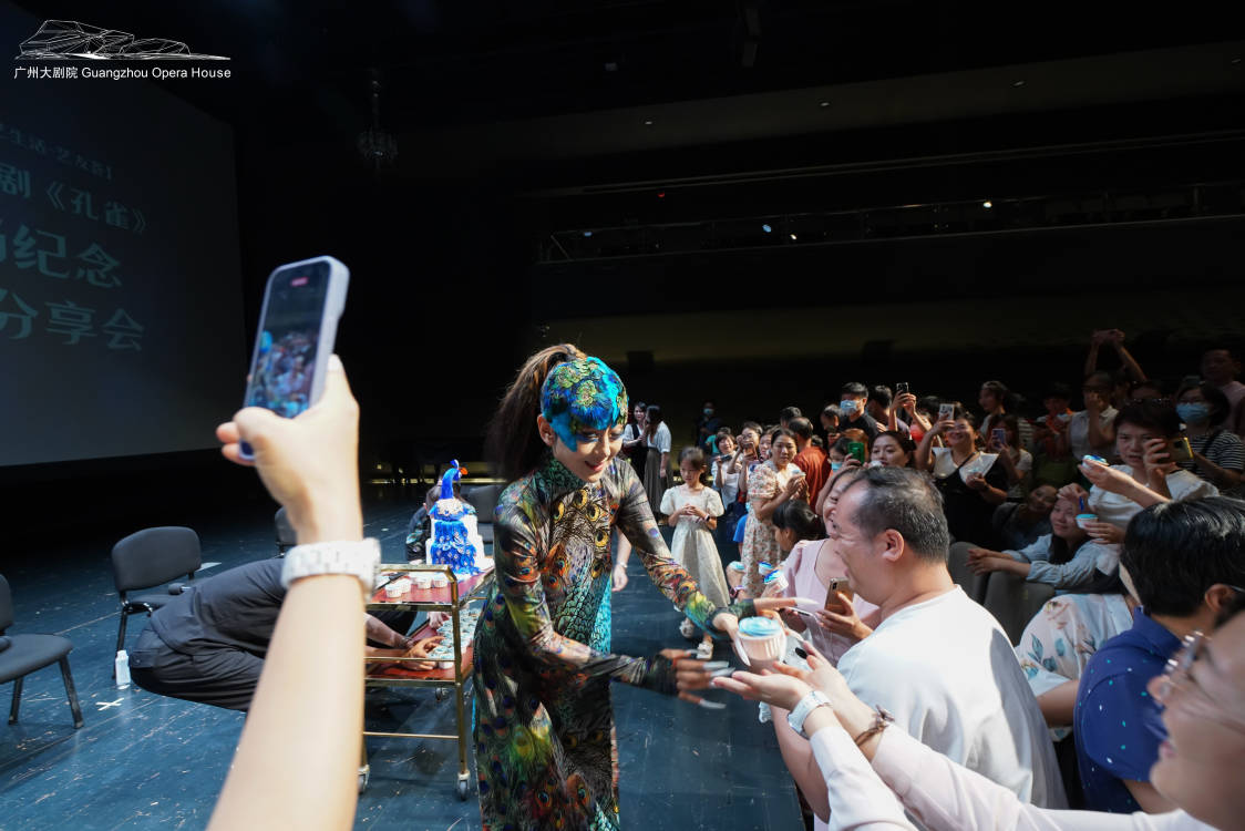 6月28日晚,2022版舞剧《孔雀》将在广州大剧院的舞台迎来它的百场演出。6月27日晚的百场纪念主演分享会上,著名舞蹈艺术家杨丽萍携剧中一众“00后”主演乔月禹、王思龙、马垣涵、杨必熙、范景玥现身,分享了该剧的台前幕后。谈心得,讲故事,互动提问,吃蛋糕,大合影……现场观众毫不掩饰地表达对杨丽萍和《孔雀》的喜爱,分享会俨然成了一个派对。