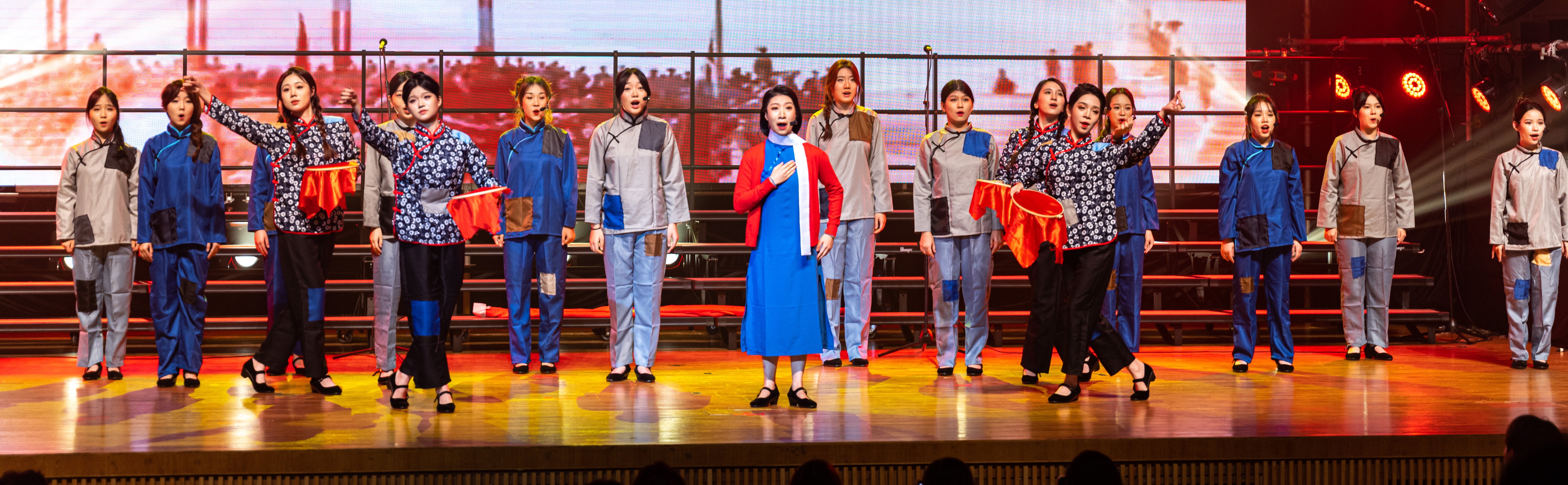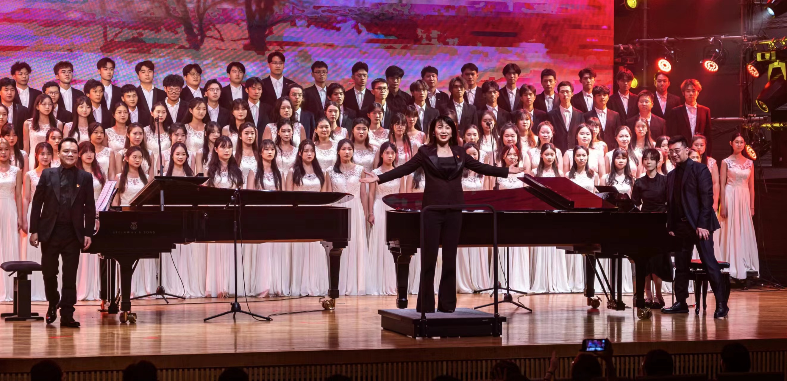 由何应聪老师执棒、音乐教育学院副院长卢格霖和余捷老师担任双钢琴演奏的压轴曲目《黄河颂》和双钢琴与合唱《保卫黄河》,再现了抗日战争时期中华儿女众志成城、英勇战斗的壮丽场景。