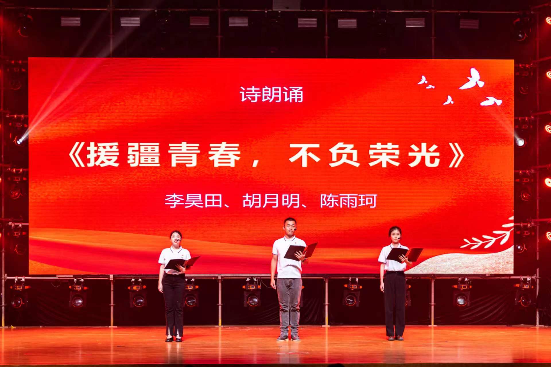 李昊田、胡月明和陈雨珂同学带来诗朗诵《援疆青春,不负荣光》,讲述了他们积极参与援疆支教、服务边疆的心声。他们心有理想情怀、肩扛责任担当,誓言要把青春之花,绽放在祖国最需要的地方。
