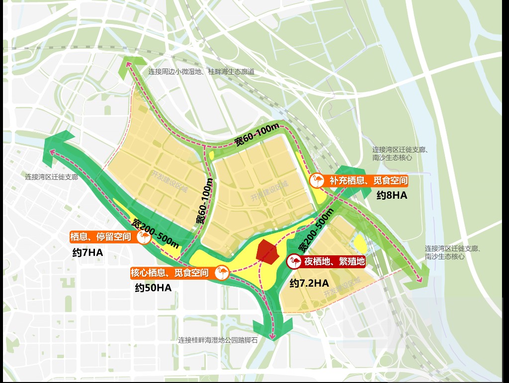 鹭鸟和人一样,有不同的需求,现在的鹭园天堂是鸟儿的“卧室”,规划的浅滩区域是鸟类的食堂,生态廊道是鸟类活动的客厅。规划基于鸟类这些不同的需求,以保护鹭鸟为第一原则,提出修复老旧竹林,碧桂路新峰路道路下穿,控制区域飞行廊道、扩大浅滩觅食区域、对建筑高度、材质、色彩、灯光控制等鸟类保护策略,实现人鸟共生。