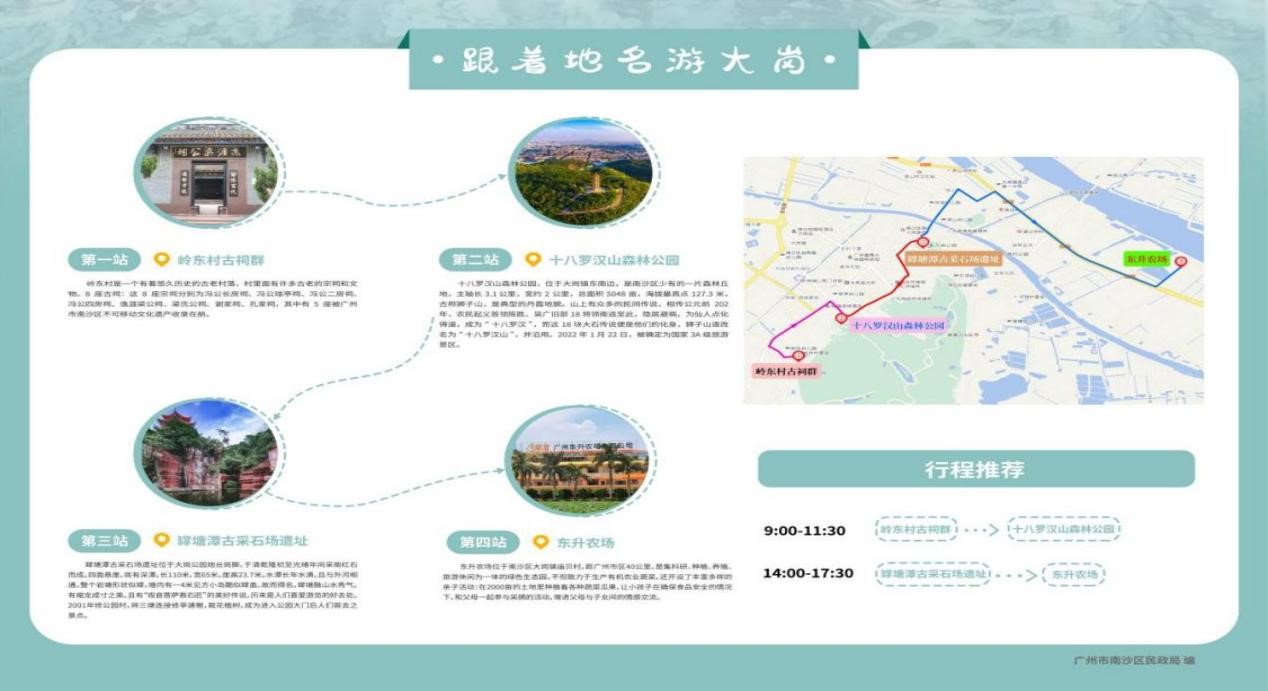 有了完整的地名信息,一方面让人们提起一个地方便能立即想到一段文化和特色,另一方面也方便了人们按图索骥“找上门”。上述工作人员透露,在采集地名信息的基础上,南沙区推出了包括乡镇特色旅游图、乡村文化示意图以及红色印记旅游图在内的“南乡畅游”系列成果,一图在手,也让更多的乡村兴趣点成为新的网红打卡点。其中,乡镇特色旅游图便收集了镇街的地方特色,制作了《跟着地名游南沙》系列。
