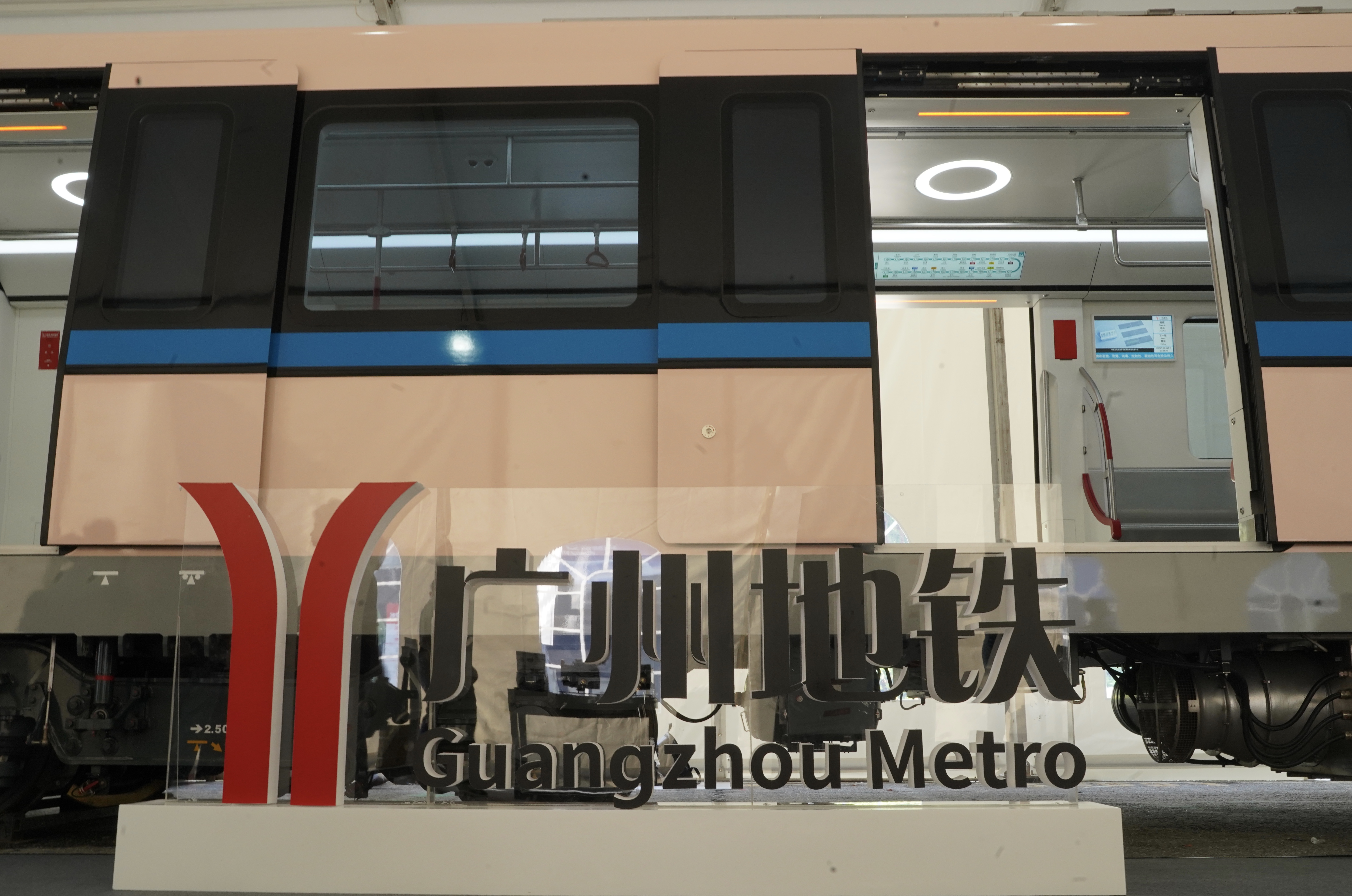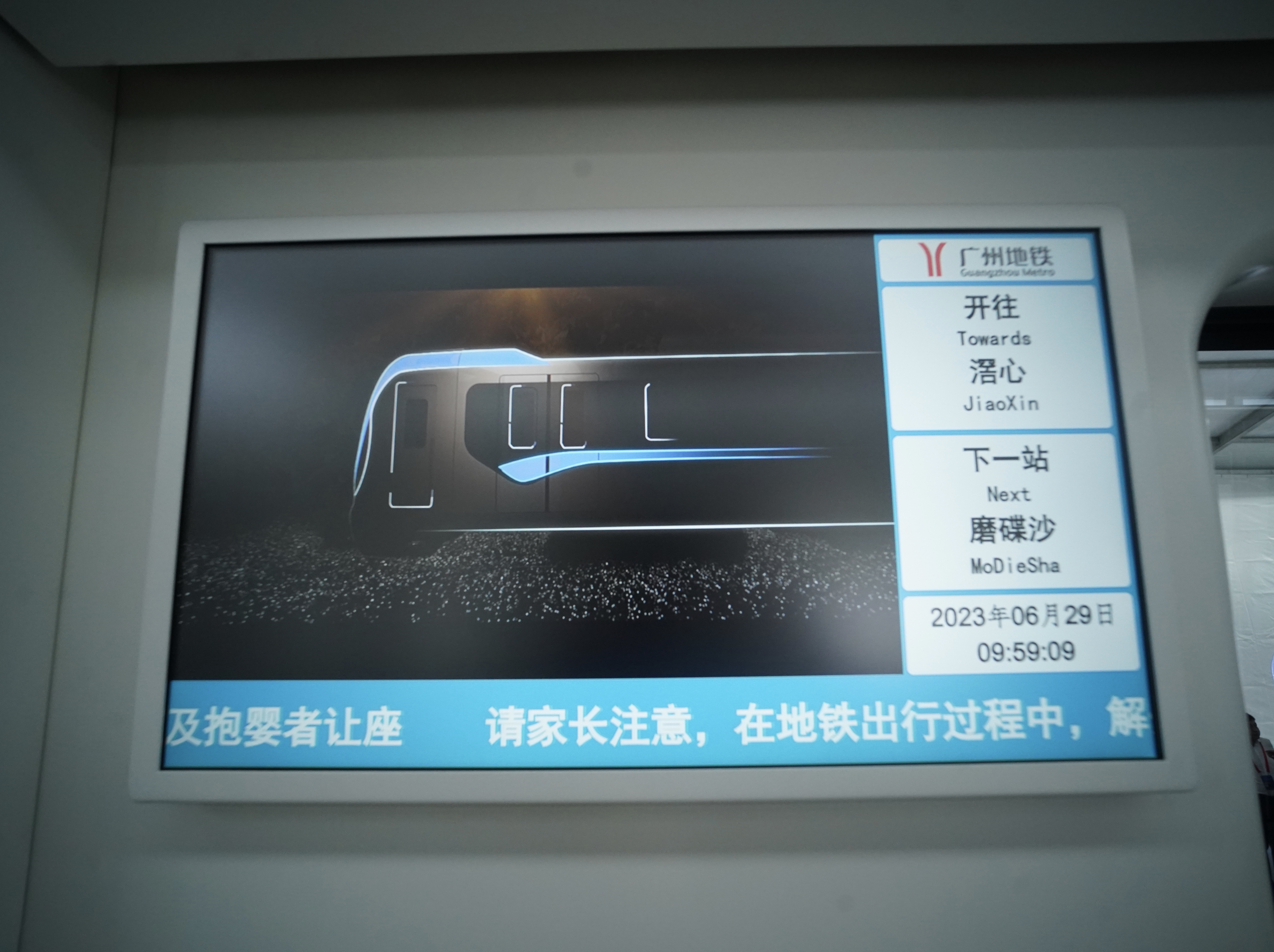 记者了解到,广州地铁二号线、八号线的列车可以通用,标准列车将在这两条线路上线。在车厢内部的显示屏,已经可以见到广州地铁八号线的线路图和报站信息。