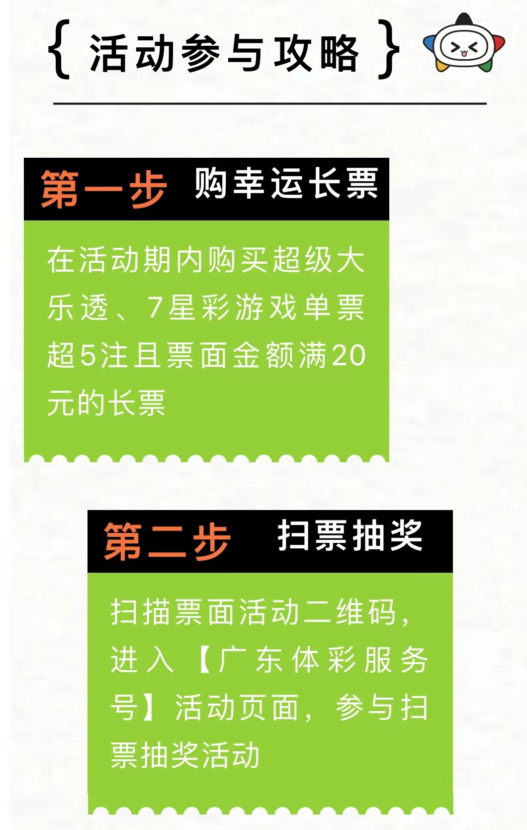 活动期内购买超级大乐透、7星彩游戏长票,单票超5注且票面金额满20元(多期票不参与活动),即可通过广东体彩服务号相应活动页面进行扫票抽奖,有机会获得大乐透体验券、7星彩体验券或10积分奖励。