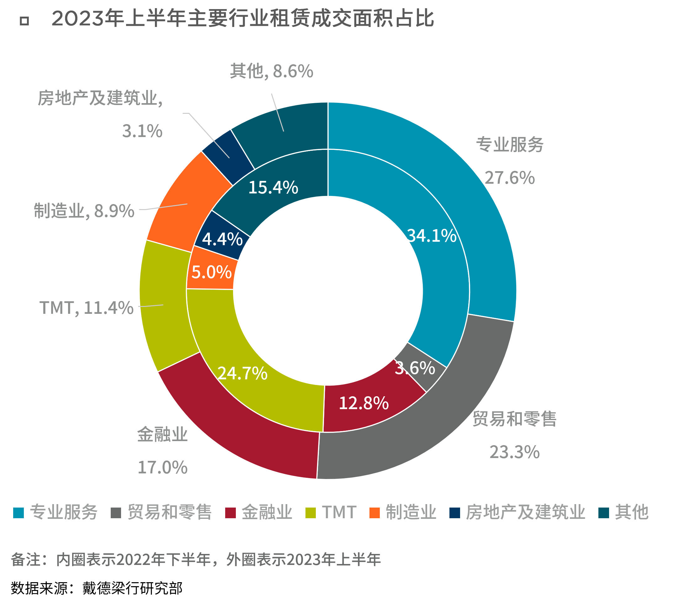 从行业需求来看,专业服务业和金融业表现稳健,其中专业服务业是上半年全市租赁成交的最大主力,占据全市租赁成交总面积的27.6%。消费市场的复苏推动贸易和零售业需求回升,成为上半年市场需求的第二大主力。一些优质客户积极把握换租窗口期进行办公空间的调整,例如欧莱雅租用欢聚大厦29000平方米办公空间。与去年下半年相比,制造业的租赁需求出现改善迹象,租赁成交面积占比扩大了4.9个百分点。宏观经济的持续复苏为市场需求带来信心。二季度,TMT行业租赁成交占比环比和同比分别扩大了6.7和1.3个百分点至13.6%。在经历了上一年度的行业调整之后,部分科技企业的需求在今年或将有所修复。值得关注的是,今年很多大面积续租的案例,基本能收获更为优惠的租金和灵活的条款;大面积的搬迁案例中,租户也在调整面积,使得办公空间更为紧凑实用,同时要求业主给予定制装修补贴等。甚至一些小面积的需求也能获得较大的谈判空间。