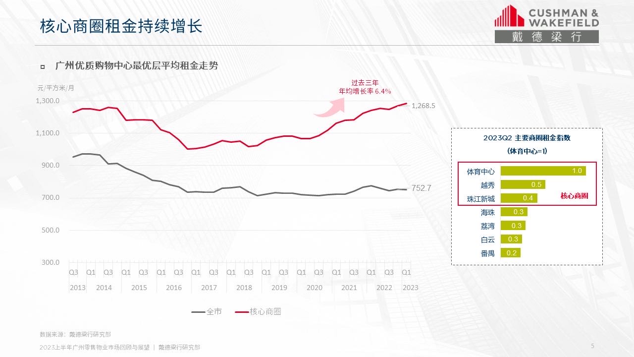 到二季度,随着新项目的集中入市,广州写字楼市场的新增供应量已为过去五年同期水平之最。6月29日,戴德梁行发布了2023年上半年度广州房地产市场最新研究报告,数据显示,今年上半年,写字楼市场迎来新增供应放量,虽然全市净吸纳量录得8.1万平方米,但充裕的供应也使得不同项目及区域之间的竞争逐渐加剧。零售市场方面,餐饮业态强劲复苏的同时,品牌拓店积极性亦有所回归,由此推动各商圈购物中心入驻率提升,全市空置率在经历连续四个季度的上升之后终于迎来回落,全市平均租金录得每月每平方米750.3元,与去年同期相比下降3.3%。
