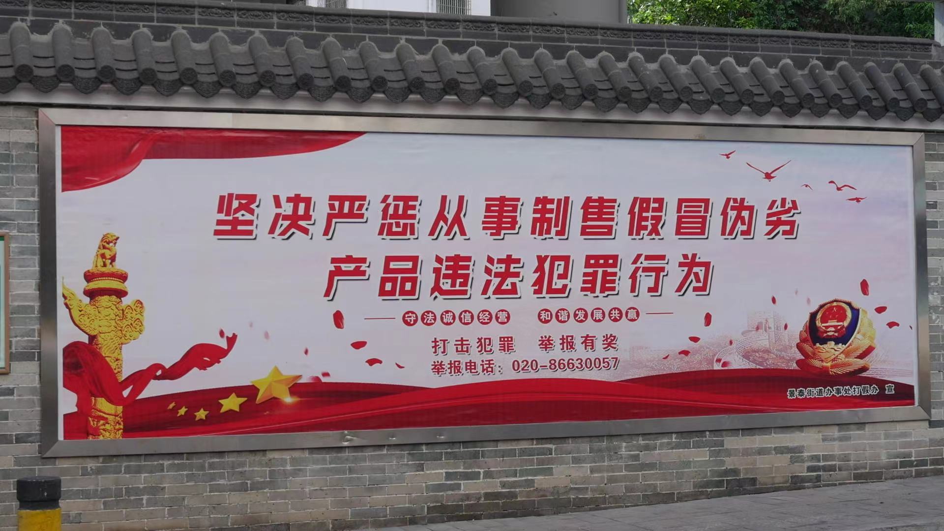 “举报制假售假有奖,揭发幕后老板有功”“白云打假力度不减,出租屋主管理须严”……走进柯子岭村牌坊,各式打假宣传标语、横幅、宣传单张随处可见,全民参与打假的浓厚氛围油然而生。从平安隧道至柯子岭西门,景泰街还专门全新打造了一条内容丰富、图文并茂的打假治劣宣传长廊,以打假标语、宣传漫画、科普知识等形式一一上墙。