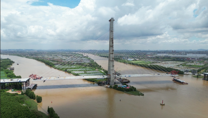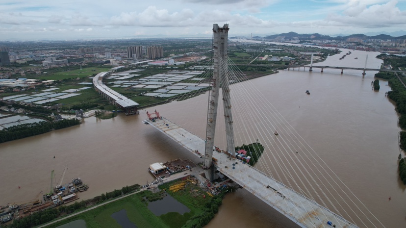 据悉,作为南沙至中山高速公路项目的关键控制性工程之一,横门西特大桥是一座全长912米的独塔斜拉桥,主塔高210米,位于中山市港口镇大南尾。此次合龙段钢箱梁长15米、宽43.2米,重330吨,由2台桥面吊机抬吊至设计桥面,经线型调整、焊接、斜拉索张拉等工序,与既有钢箱梁焊接成整体,实现小榄水道侧钢箱梁合龙,下一阶段将进行鸡鸦水道侧钢箱梁吊装施工。