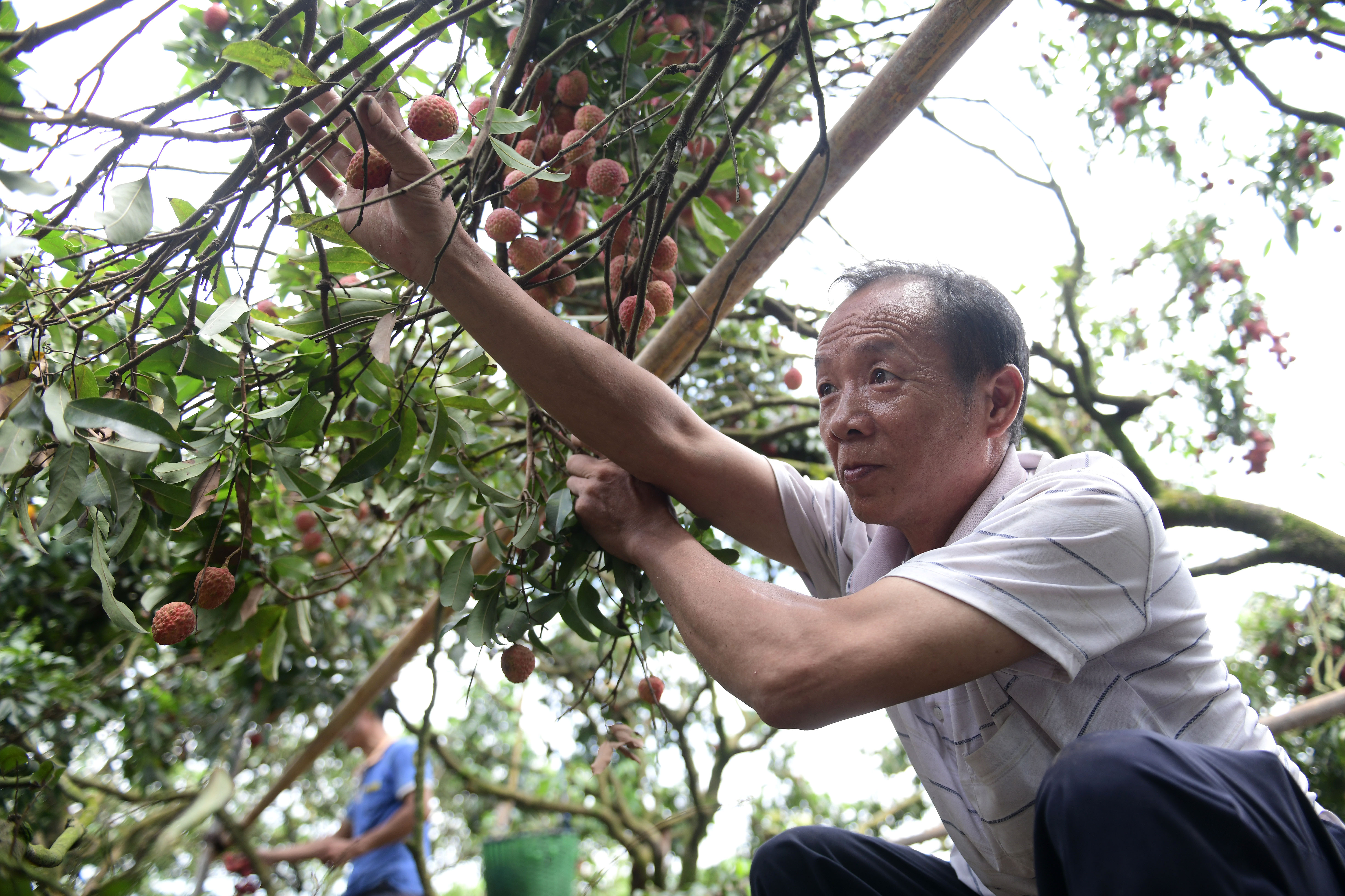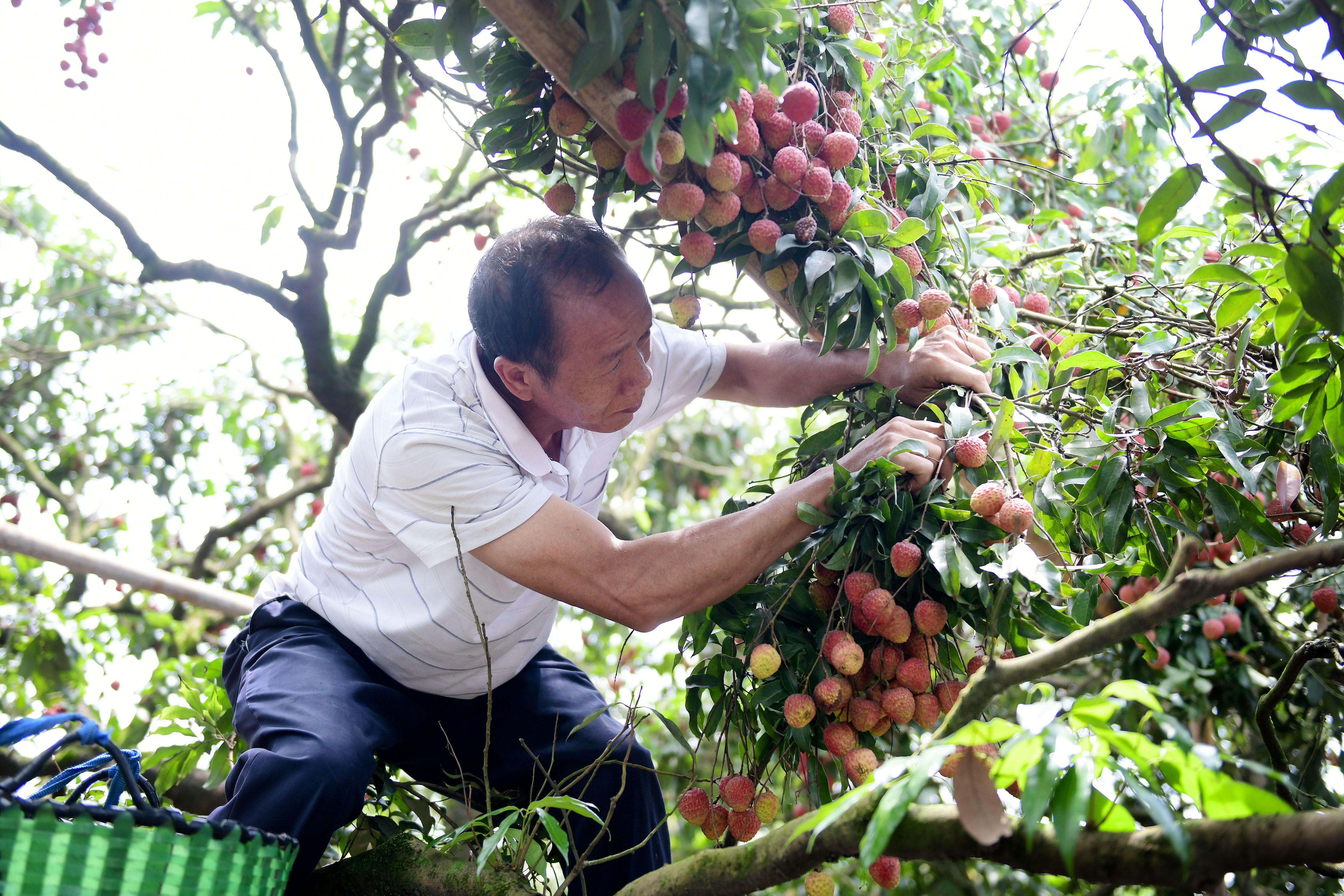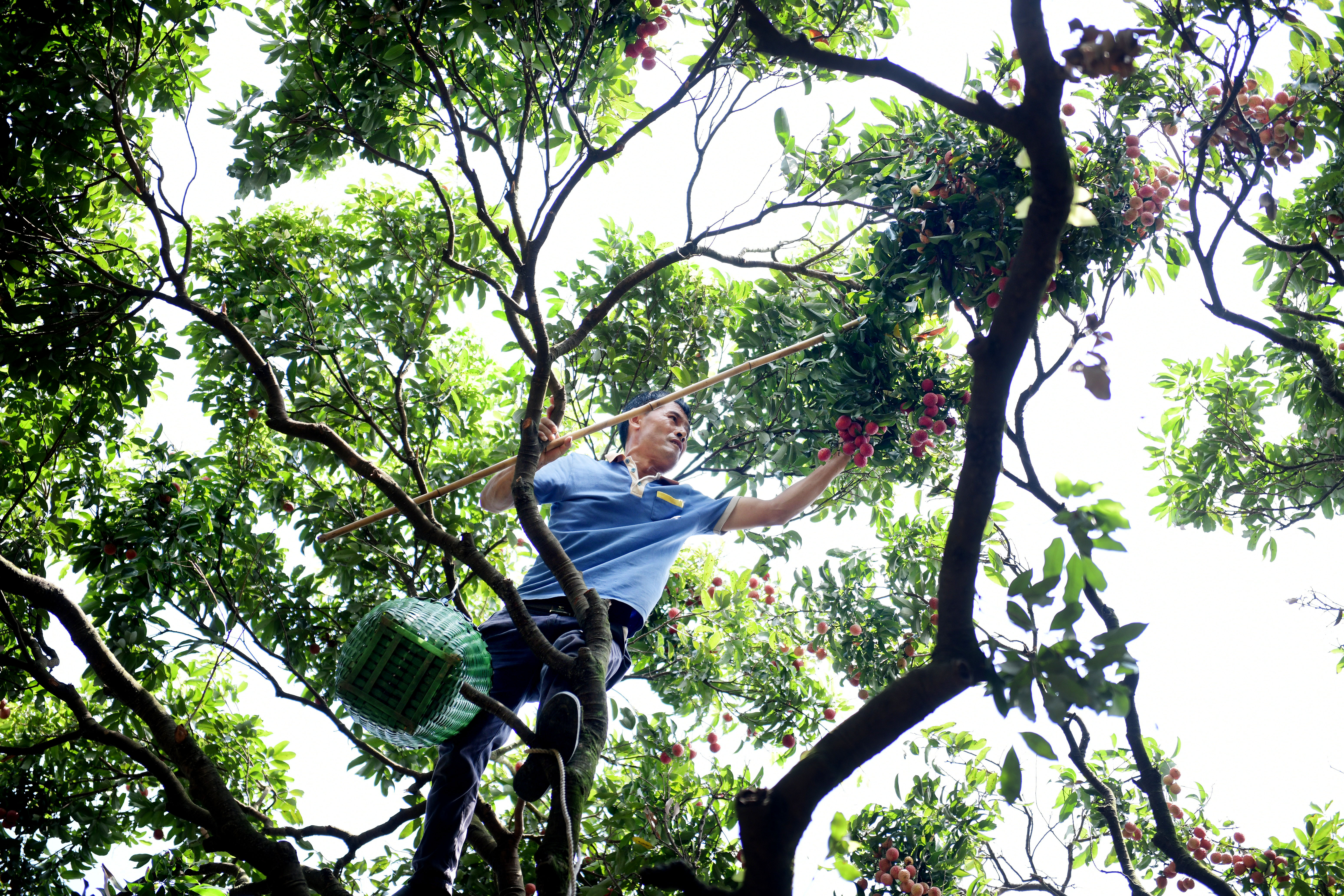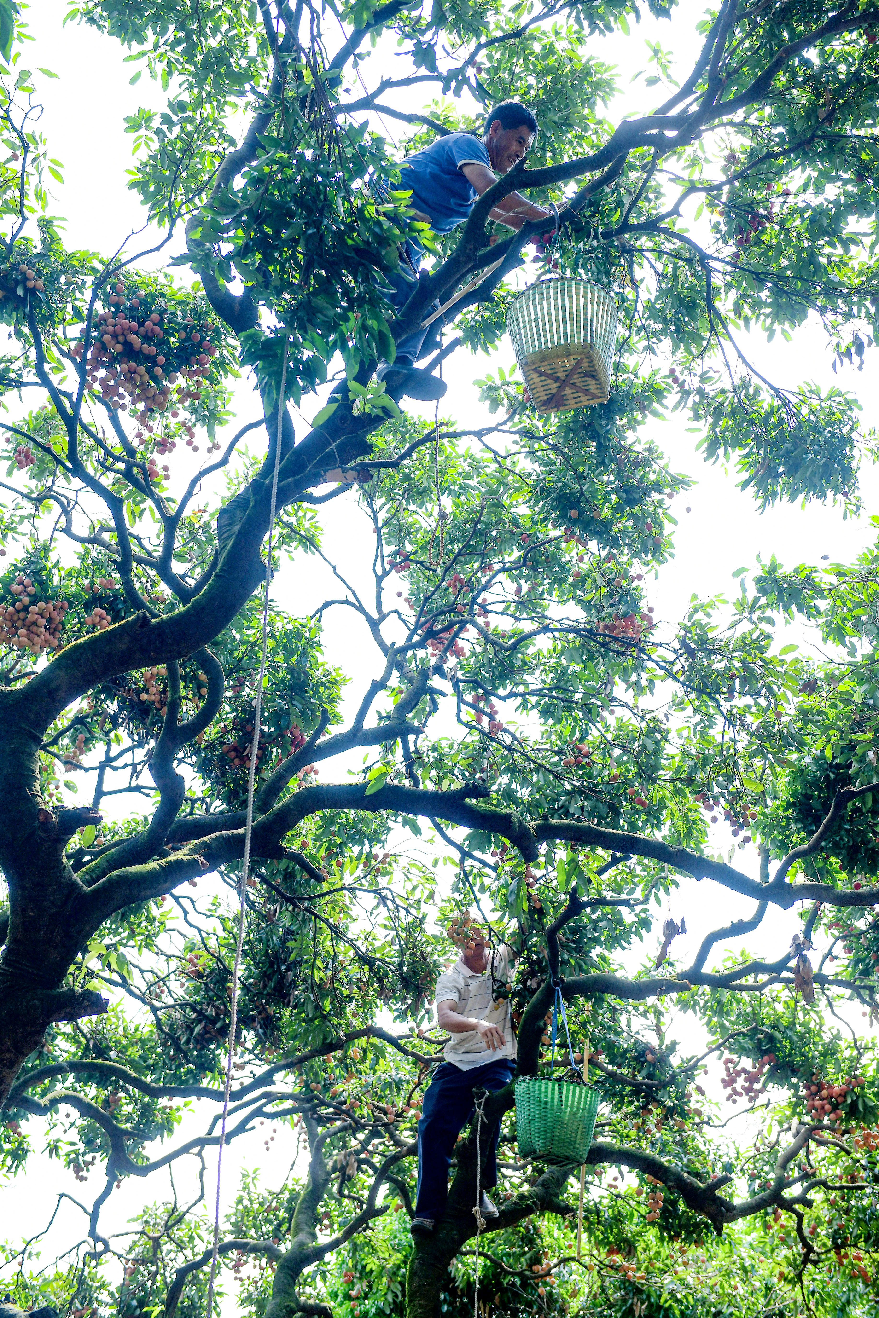 “摘荔枝有三宝,长钩、缆绳、挂篮”,这些技巧刘炽波熟稔于心,十几岁就随家人务农,荔枝于他不止是饮食,更与一家的生计有关。刘炽波今年已年逾五十,但登高上树身手依旧矫健。