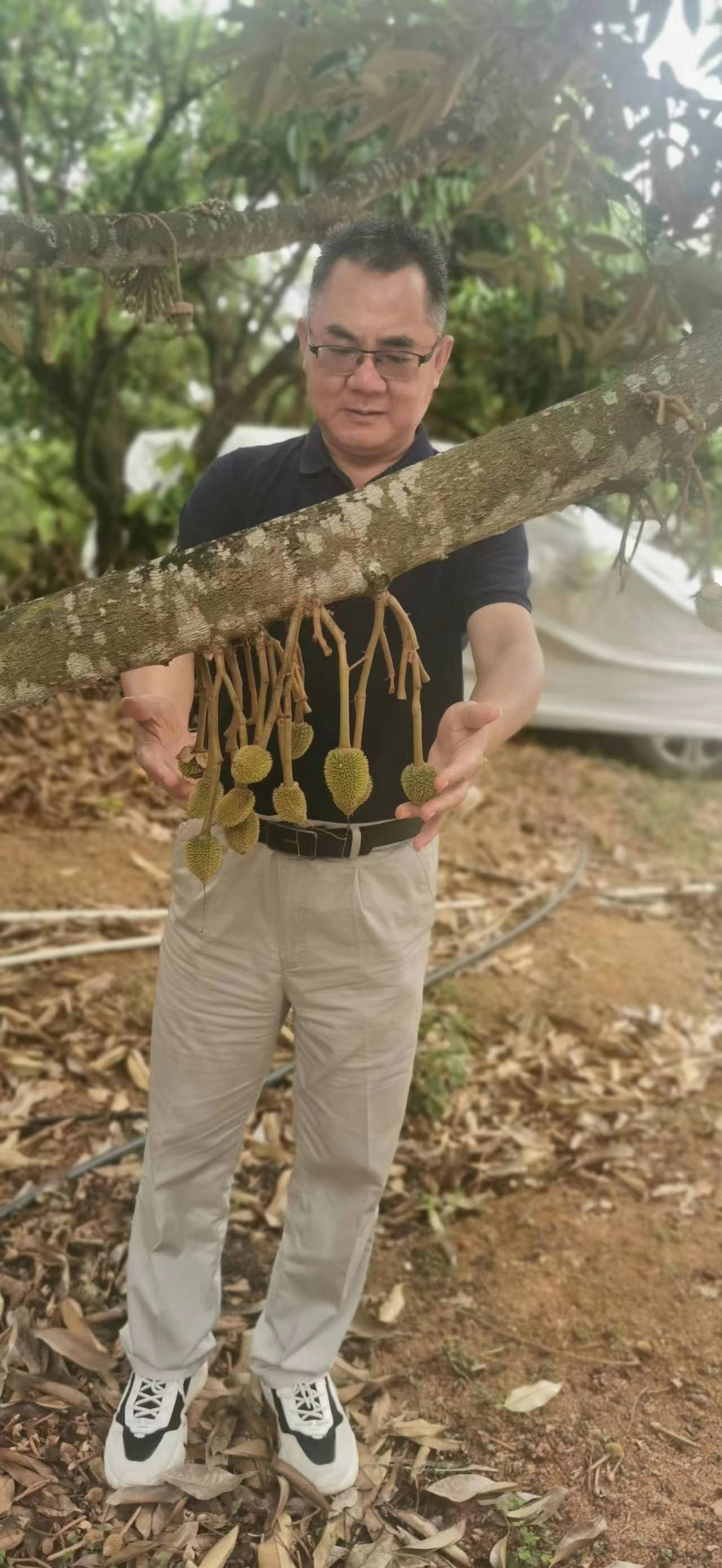 冯学杰在榴莲种植场检查榴莲果长势